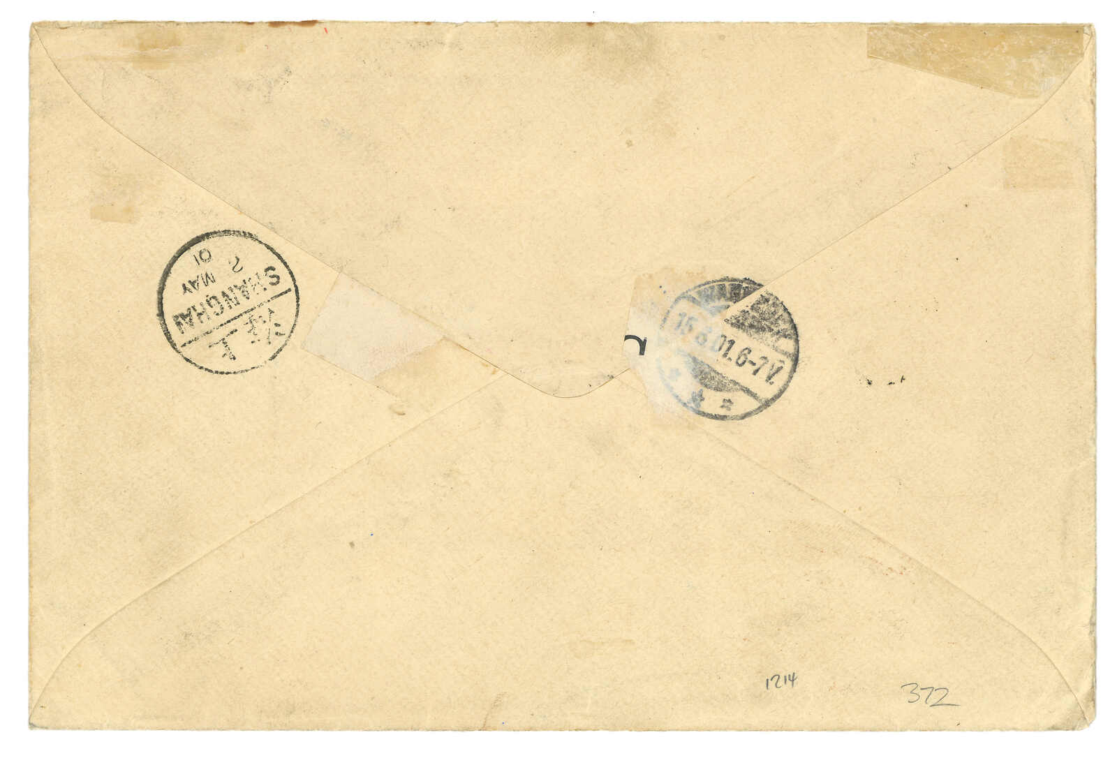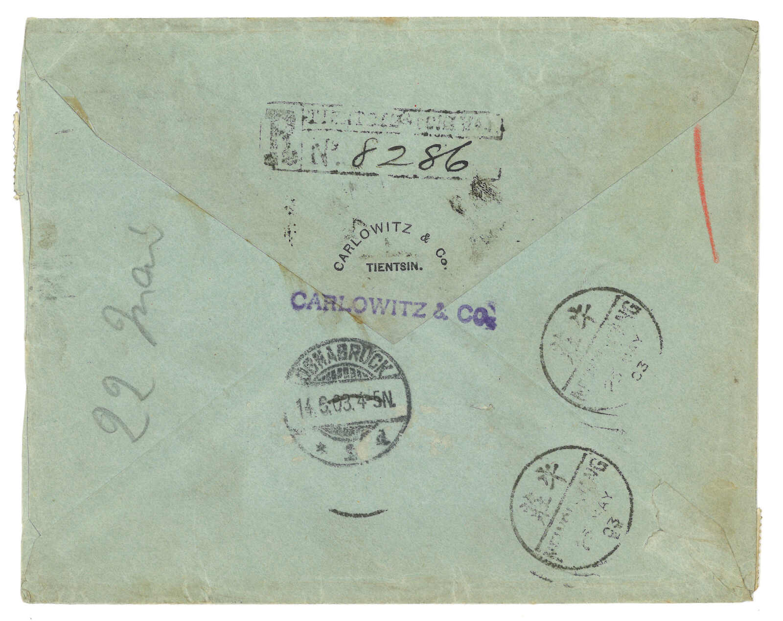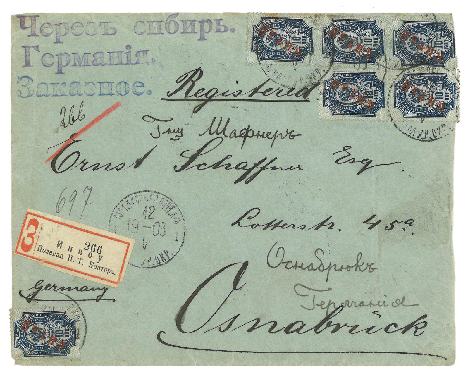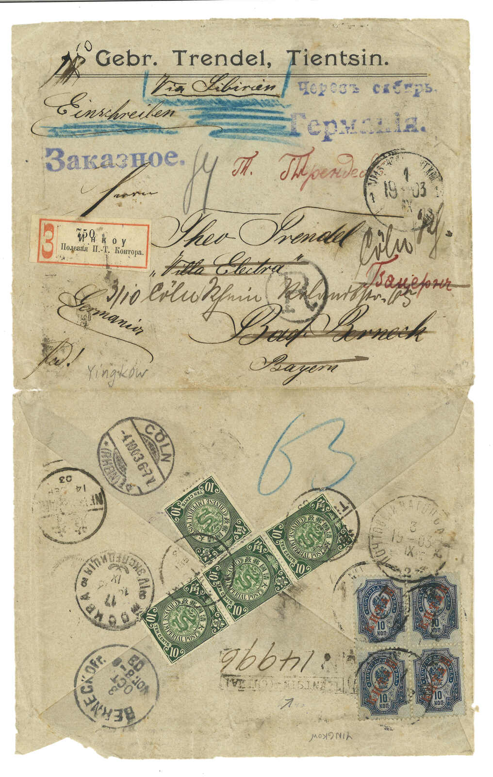 199 image1903 Tientsin to Germany via Siberia, probably f.w. Chinese adhesive but dropped, alongwith Tientsin reigstered label. Transit Newchwang (25 May). F.w. Coat of Arms ovpt. KITAI 10k x6 on front, tied by Inkow (Newchwang) Russian FPO No. 13 T&S type 1 cds (12 May), along with Russian registered label. Arrived Germany (14 Jun).