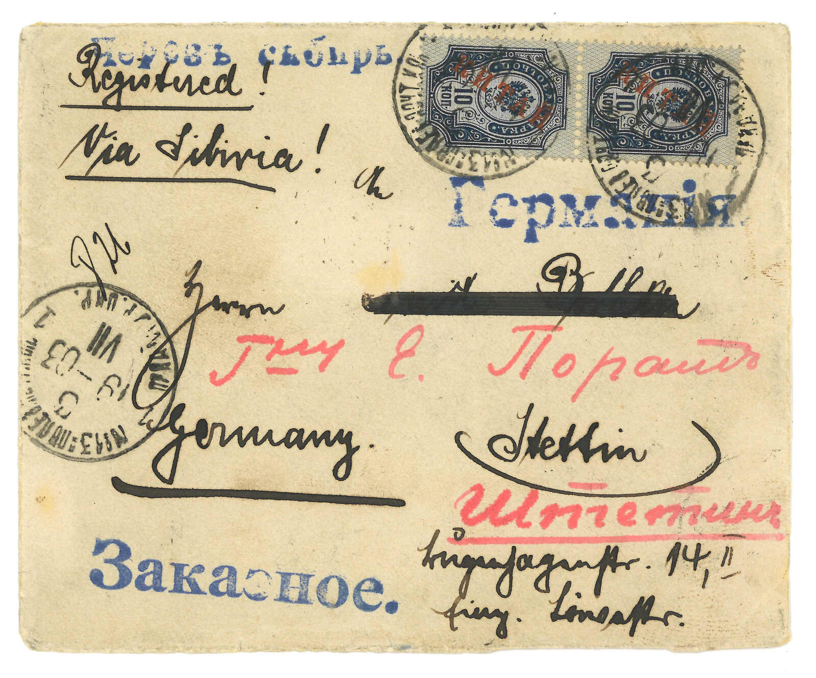 1903年天津經西伯利亞寄德國,應貼有中國票但掉落,鈐天津掛號章。5;25經牛莊。加貼軍徽圖加蓋KITAI 10戈比x6,銷營口(牛莊)俄軍13局T&S 1型日戳(5.12),另貼俄文掛號標籤。6.14抵德國。(Image 1) (Image 2)