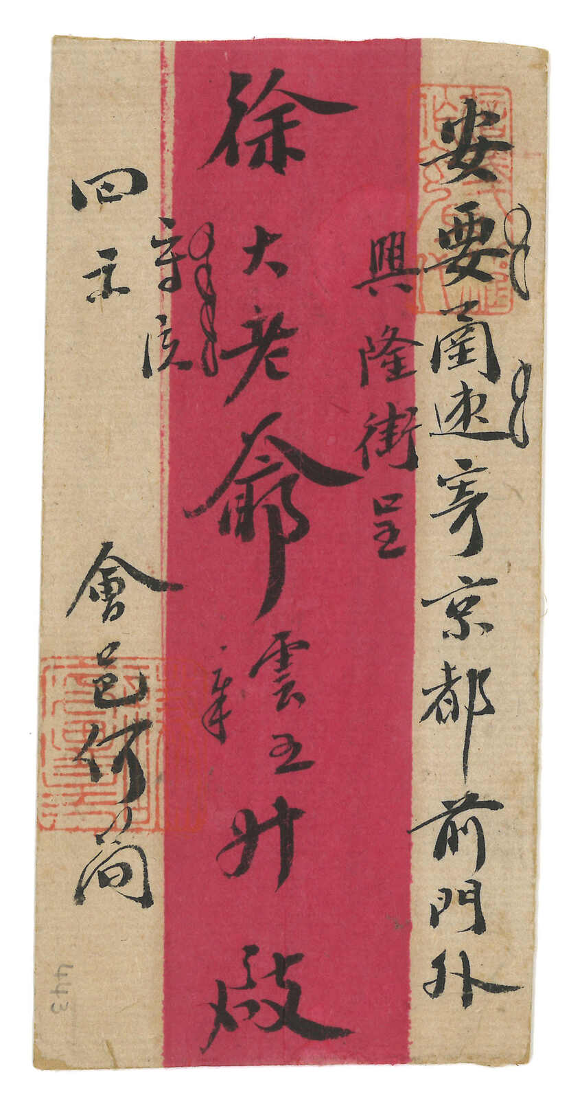205 cover image1901 Peking (27 Apr) to Germany. Registered cover, f.w. Litho Dragon and Coiling Dragon x12, in total of 30c, tied by oval Peking PO d.s, along with scarce type 15-2-3 Peking handfilled registered mark. Transist Shanghai Chinese PO (2 May). In combination with Hong Kong QV 30c, tied by Shanghai BPO (7 May) cds. Arrived Germany (15 Jun). Nice Peking reigstered cover.