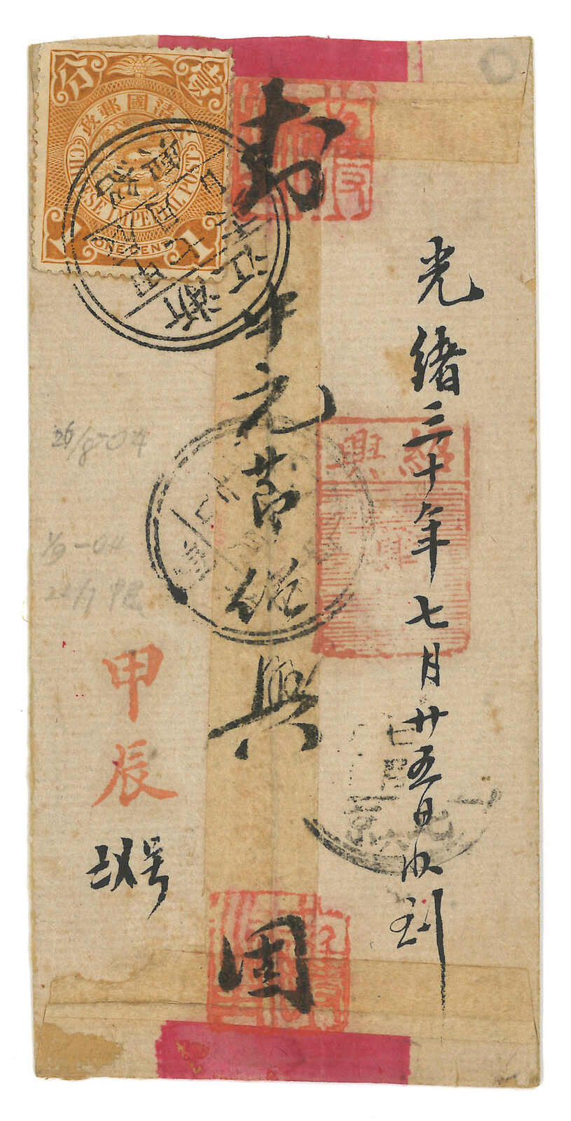 1904年一對國內紅條封,出自紹興及大通,分別貼蟠龍1分及2分,鈐紹興碑形戳及各地雙圈干支日戳。外埠郵資於1904年9月1日由1分上升至2分。(Image 1) (Image 2) (Image 3) (Image 4)