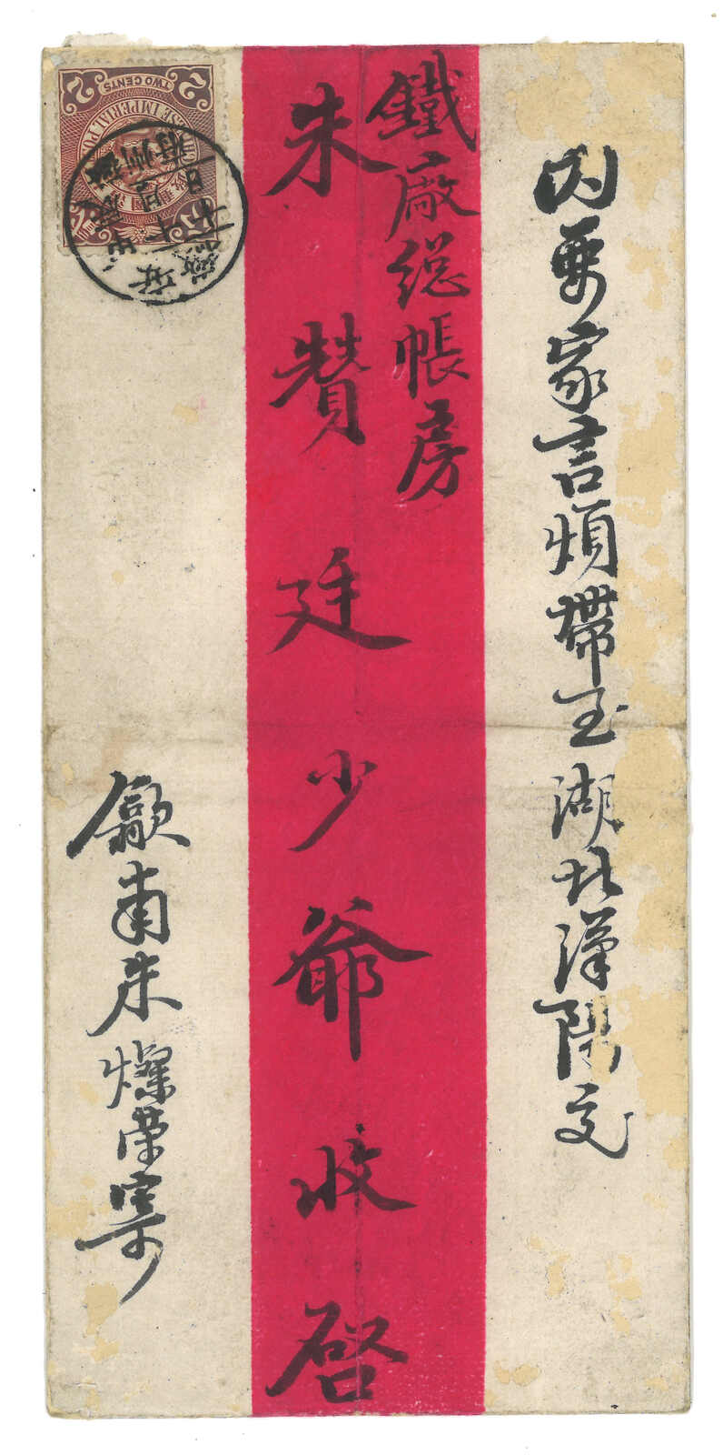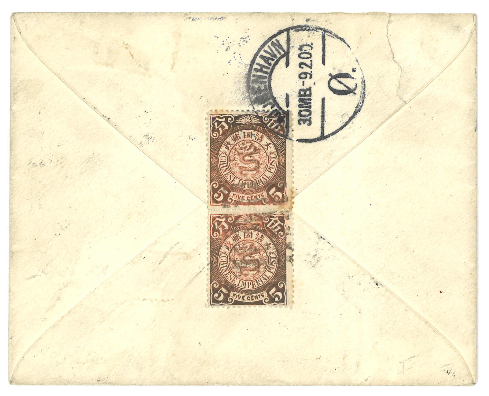 212 cover image1900 Shanghai (12 Jan) to USA, f.w. Coiling Dragon 10c, tied by pakua chop, matching with Shanghai bisected bilingual cds on reverse. In combination with Koban 5s in pair, tied by IJPO Shanghai (16 Jan) cds. Transit Yokohama (22 Jan), Tacoma (10 Feb). Arrived Little Mills (14 Feb). Ex- James Starr.