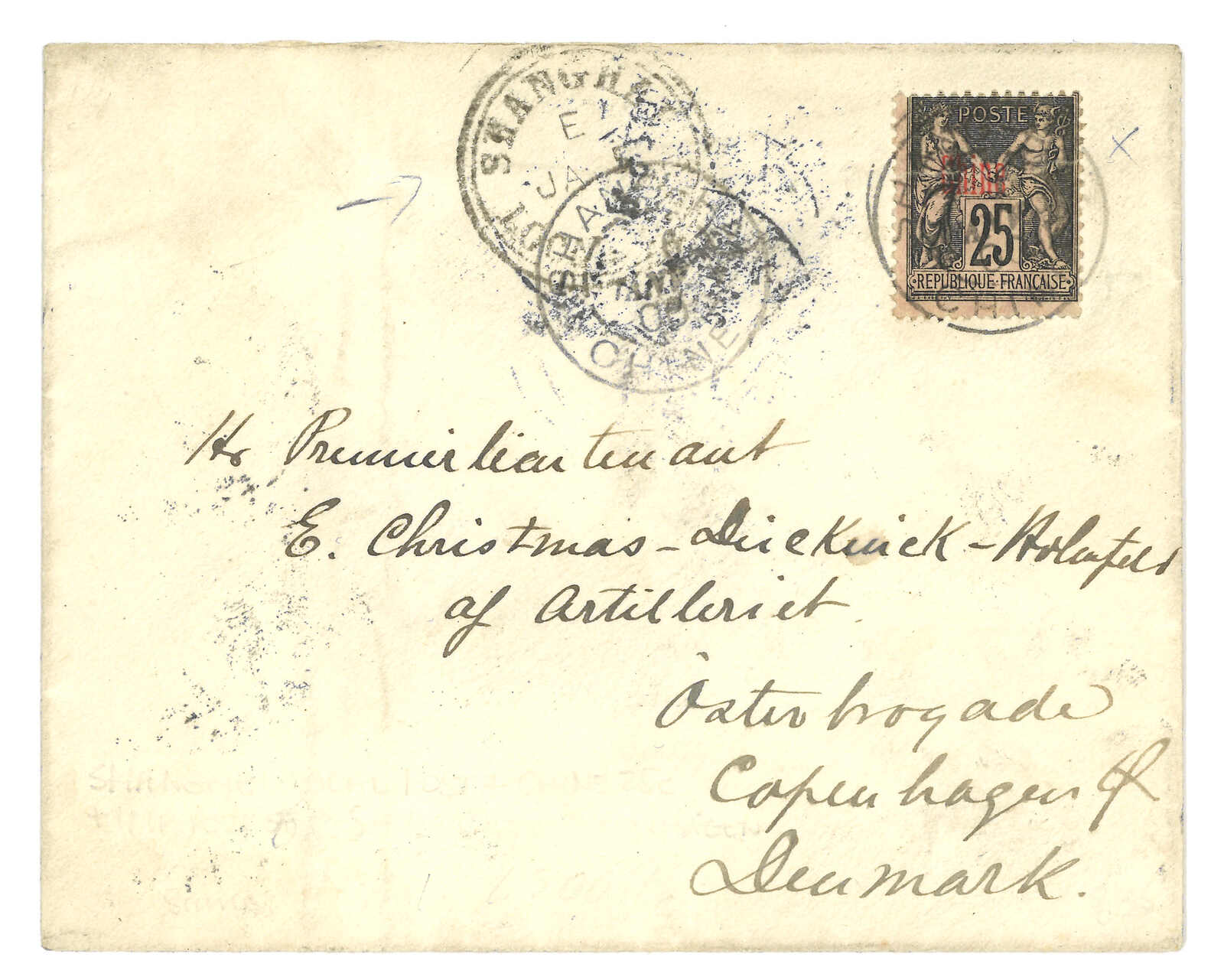 1900年上海寄丹麥,鈐上海工部郵局始發日戳。正背貼蟠龍2分雙連及法國客郵25生丁,分別銷模糊之碑形戳及上海法局日戳。2.9抵哥本哈根。工部郵局、大清郵政及法國客郵合作投遞之出色例子。(Image 1) (Image 2)