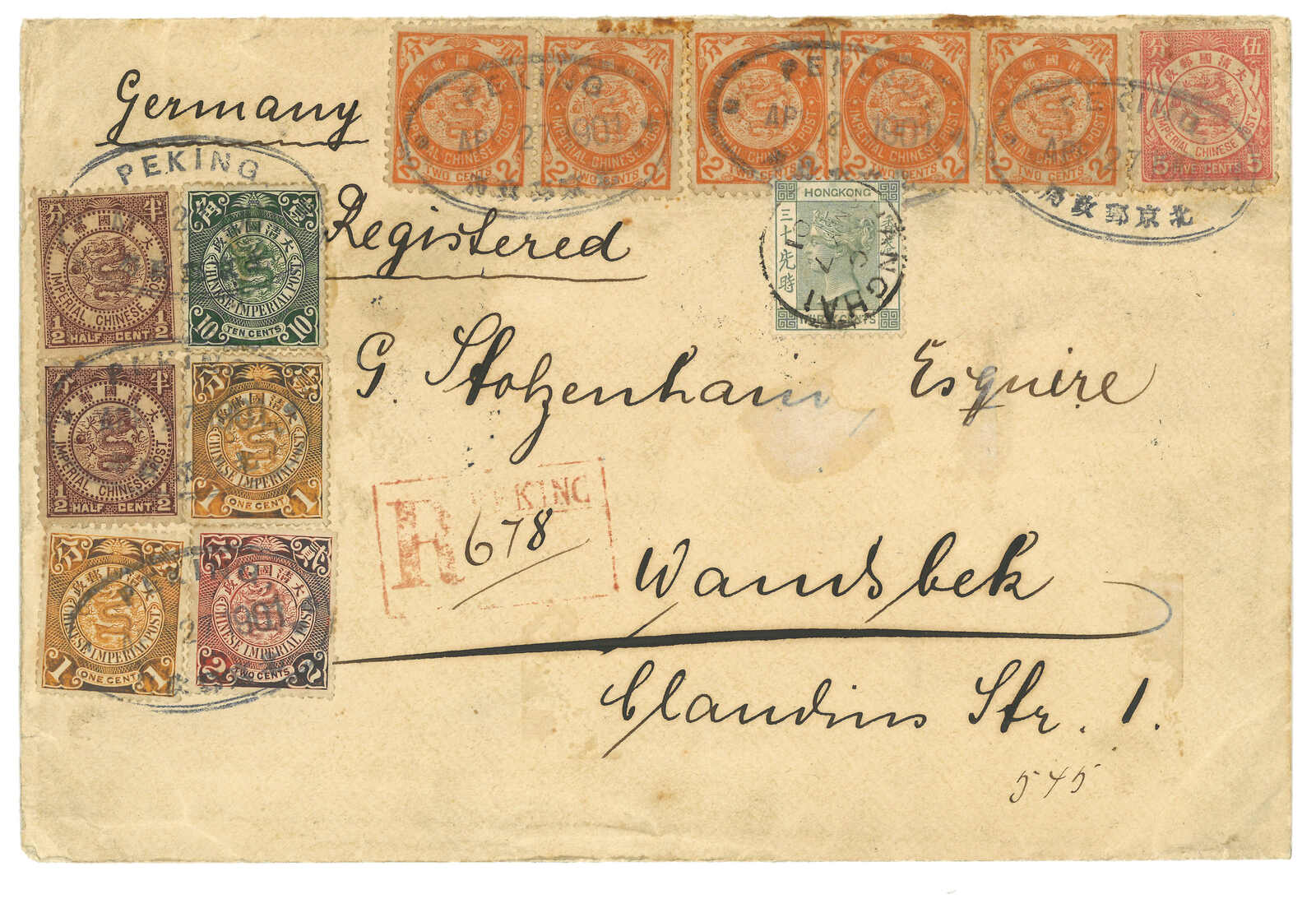 1901.4.27 北京寄德國。掛號封,貼日本版及倫敦版蟠龍12枚,合3角,銷北京半切漢英日戳。另見罕見之15-2-3型北京手填英文掛號章。5.2經上海清郵。加貼香港維多利亞女皇像30仙,銷上海英局5.7日戳。6.15抵德國。出色之北京掛號封。(Image 1) (Image 2)