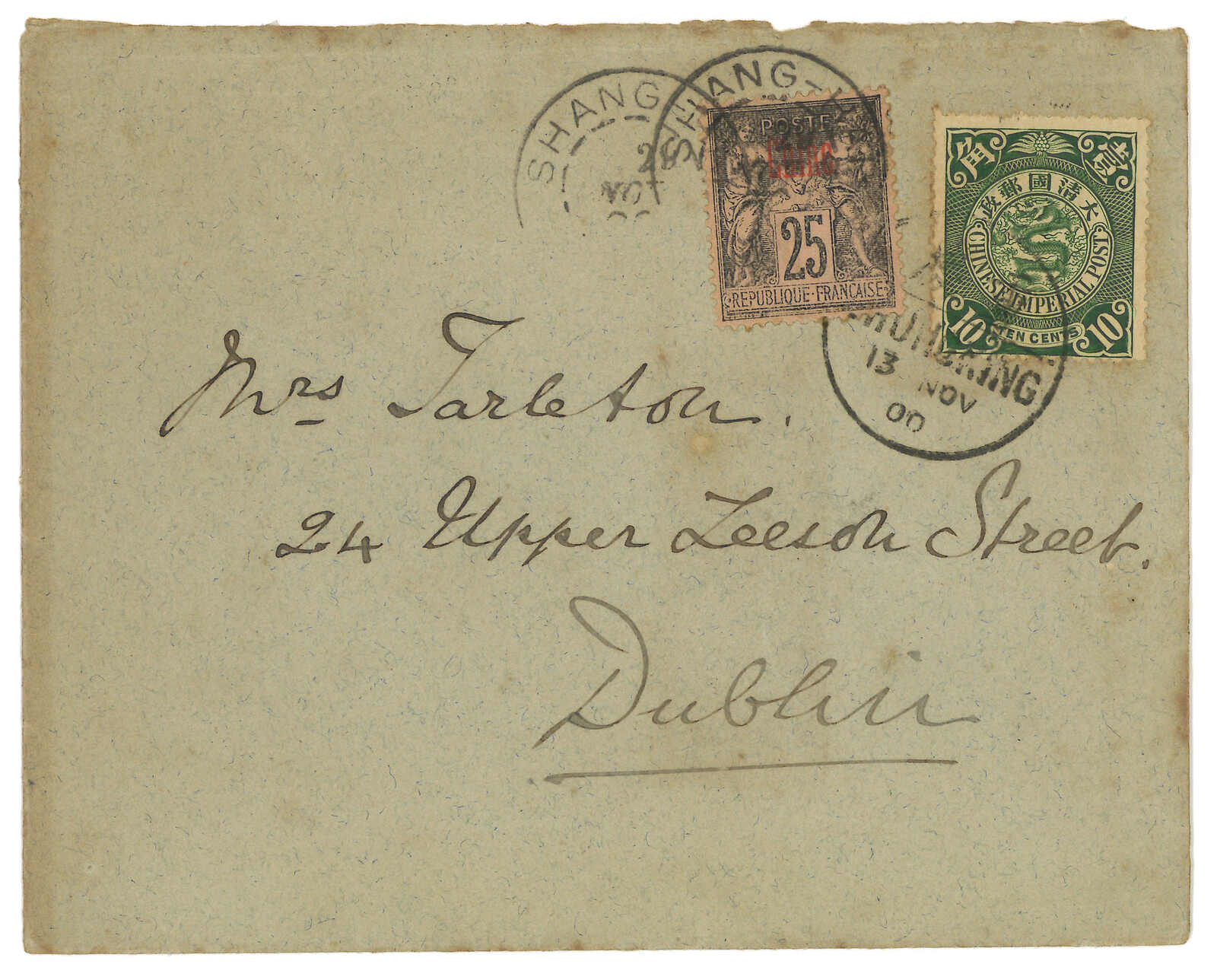210 cover image1900 Chungking (13 Nov) to Ireland, f.w. Coiling Dragon 10c, tied by Chungking bisected bilingual cds. In combination with Peace and Commerce ovpt. Chine 25c + 1 dropped stamp, tied by Shanghai French PO (29 Nov) cds.