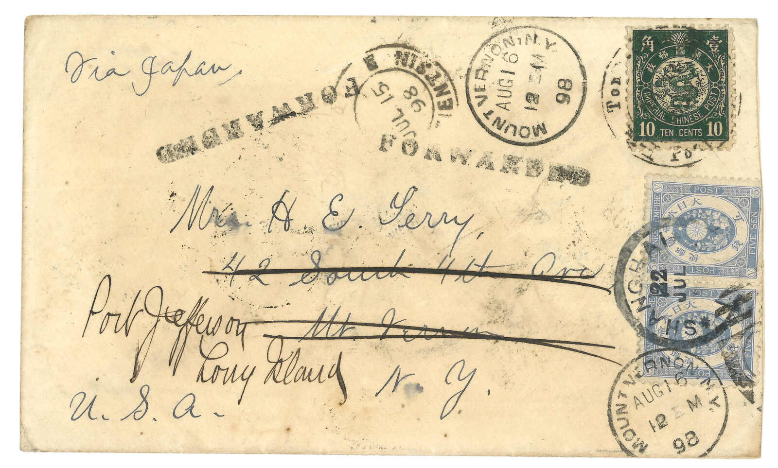 211 cover image1898 Tongshan (Jul) to USA, f.w. litho dragon 10c, tied by scarce Tongshan Post Office cds, Transit Tientsin (14 / 15 Jul) with dollar cds and “Customs” removed cds, Shanghai (21 Jul) with dollar cds. In combination with Japanese Koban 5s in pair, tied by IJPO Shanghai (22 Jul) cds. Arrived Mount Vernon (15 Aug) with “FORWARDED” cachet and redirected to Port Jefferson.