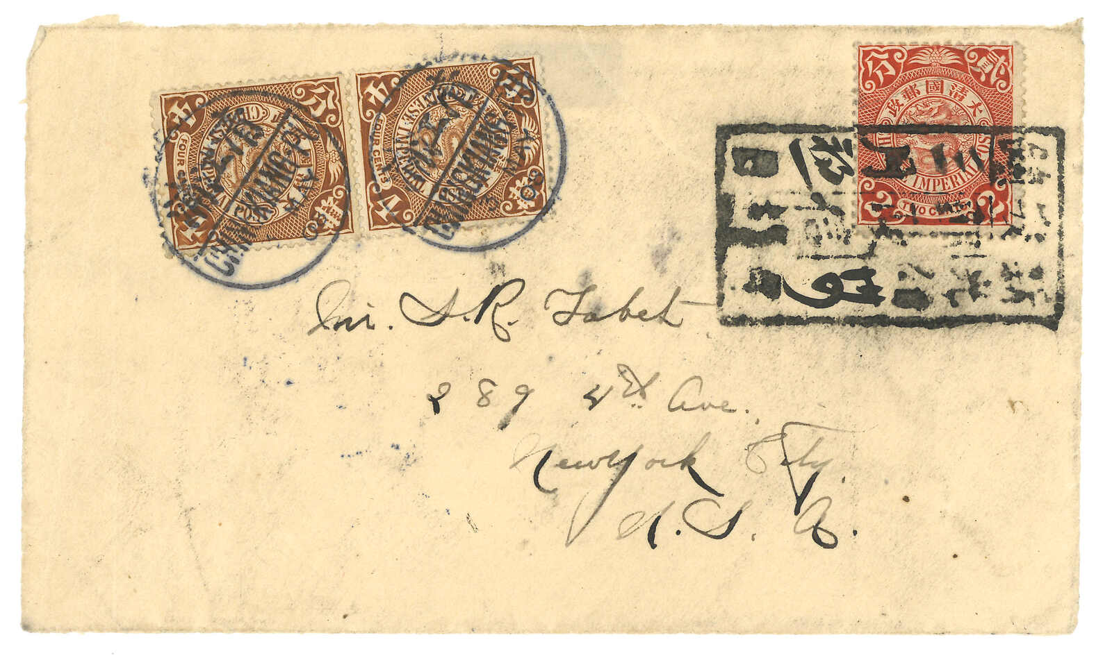 214 image1908 Sinchuanchen to USA. Cover front only, f.w. Coiling Dragon 2c + 4c in pair, former tied by scarce "Sinchuanchen Postal Box" handfilled tombstone cancel while latter tied by Tsingkiangpu bisected bilingual cds (3 May).
