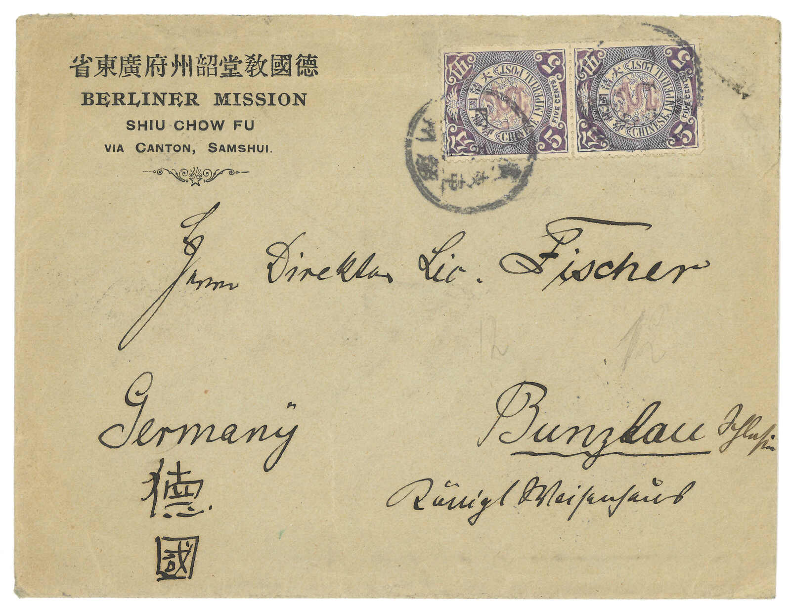 1908.6.2 韶州寄德國,貼蟠龍1角雙連,銷廣東韶州支干日戳。6.5經三水,6.5經廣州中國郵局,6.6經廣州法局。7.9抵德國。(Image 1) (Image 2)