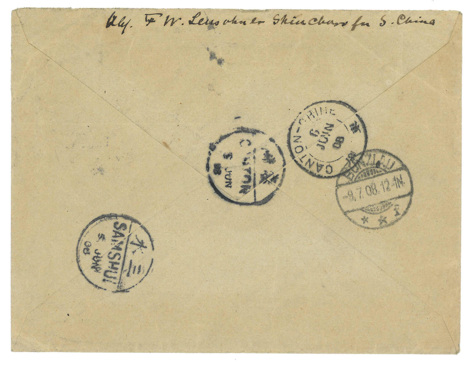 215 cover image1908 Shiuchow (2 Jun) to Germany, f.w. Coiling Drago 10c in pair, tied by Kwangtung Shiuchow lunar year cds. Transit Samshui (5 Jun), Canton Chinese PO (5 Jun), Canton French PO (6 Jun). Arrived Germany (9 Jul).