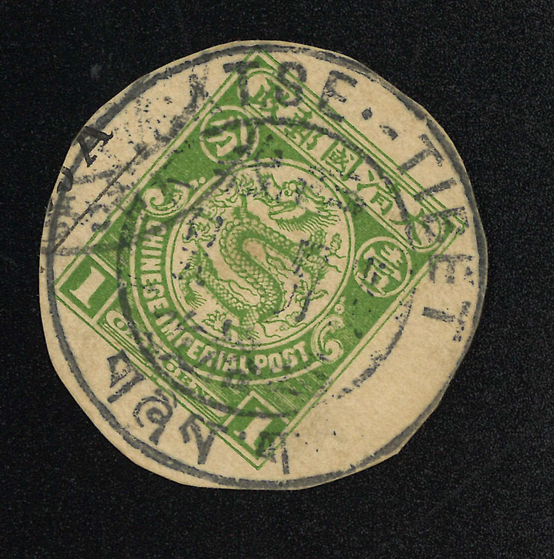 西格孜大圓戳蓋於大清第四版郵資片之剪片。由於西藏使用之清片極為難得,存世僅十來件,故此剪片不失為另一入手途徑。附Geoffrey證書。(Image 1)
