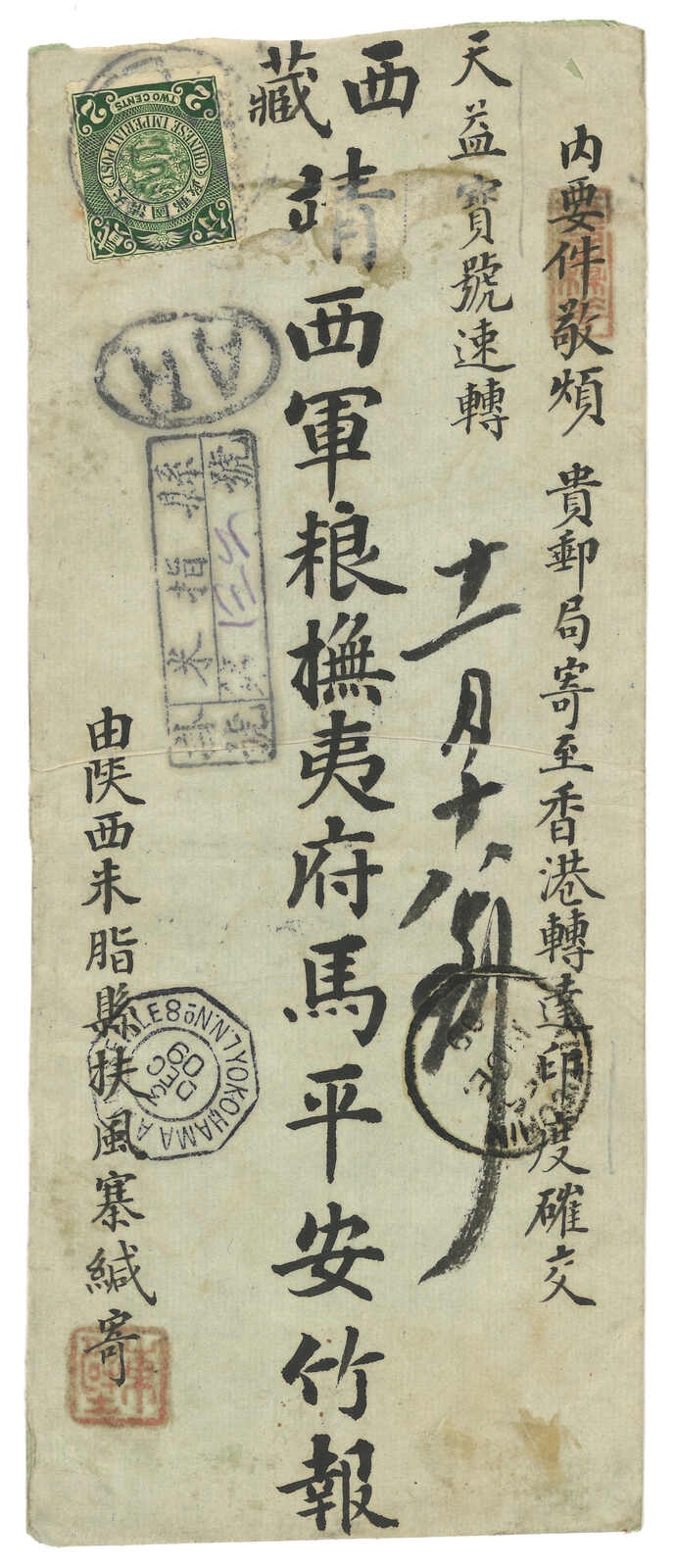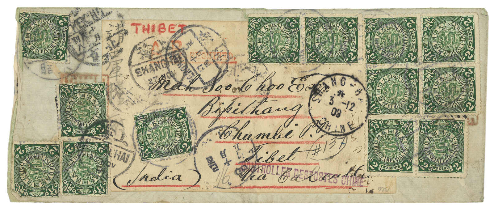 1909年米脂經印度寄亞東。雙掛號封,正背共貼蟠龍2分共十四枚,合2角8分,銷山西米脂腰框日戳,正面另鈐掛號章及橢圓形AR章。11.16經汾州,11.20經北京,11.27經上海清郵,12.3經上海法局,同日經橫濱至馬賽郵船,12.19經Tuticorin。背面鈐“CONTROLLER DES POSTES CHINE”橫戳。此信經天益號轉寄,其東主陸興祥曾被任命為駐藏長官但受阻撓。王劍智及蔡盛著《青康藏郵驛史》第141頁第2號圖例原件。(Image 1) (Image 2)