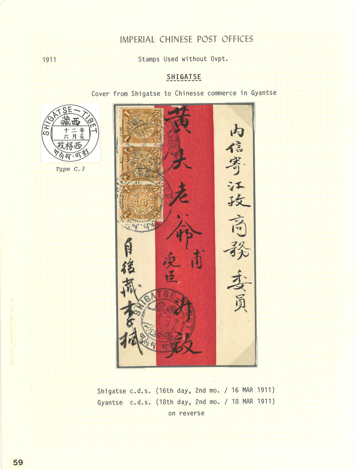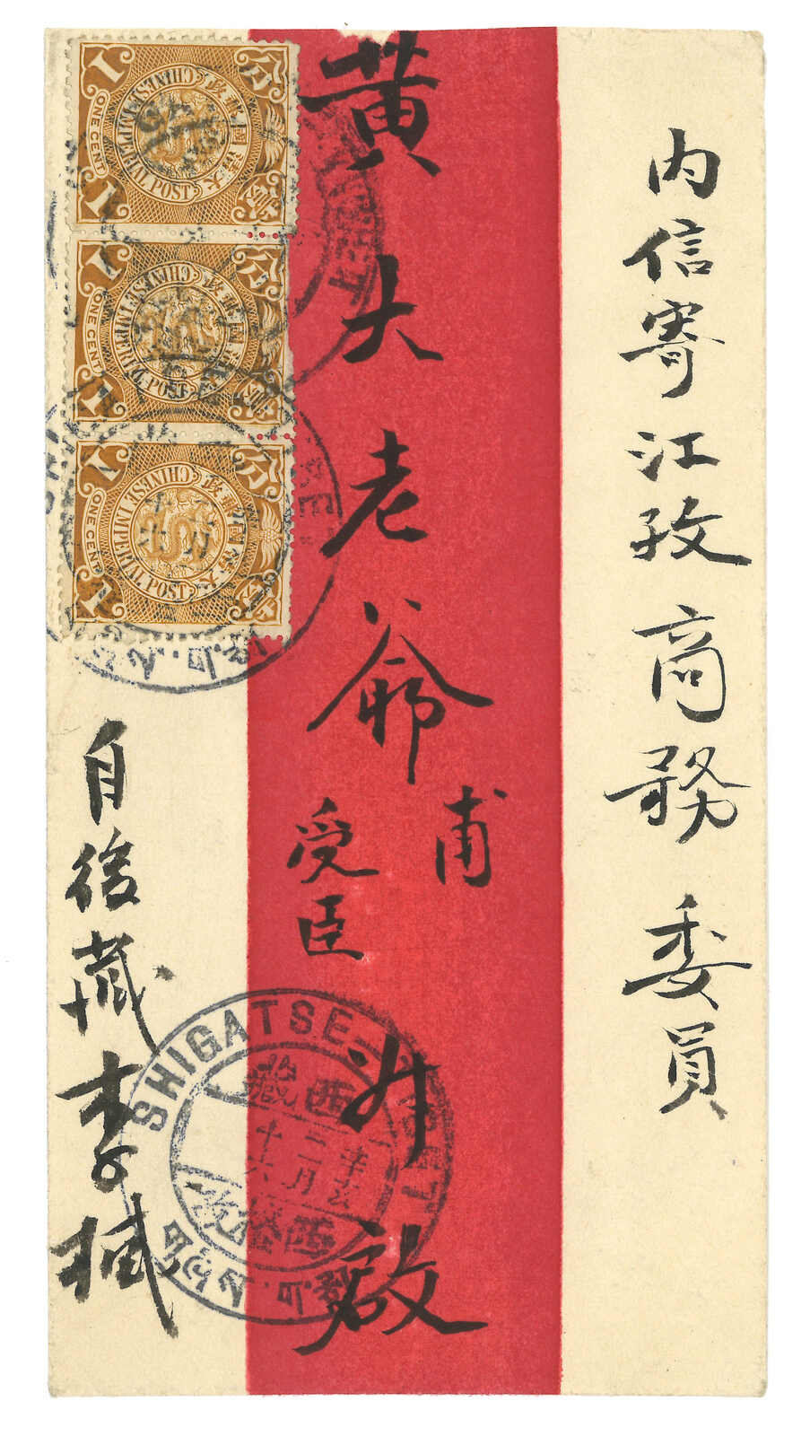 1911.3.16 西格孜寄江孜商務委員。紅條封,貼蟠龍1分橫三連,銷西格孜大圓戳。3.18抵江孜,同樣鈐大圓戳。(Image 1) (Image 2) (Image 3)