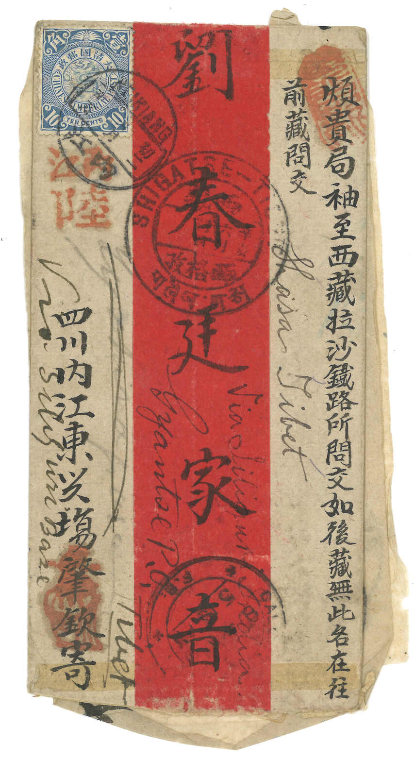 1911.4.30 內江寄拉薩鐵路所。紅條封,貼蟠龍1角,銷內江腰框英漢日戳。5.2經重慶,同月經上海中國郵局,5.17經上海英局,5.22經香港,6.11經基地郵局,隨後經江孜。6.22抵拉薩。後貼改寄憑單改寄西格孜(6.29),但收件人仍未尋獲,故再貼憑單退回寄件人。但不知何故此封並無退回,終於落入萊登拉的故紙堆中。四川寄西藏之難得例子。(Image 1) (Image 2)