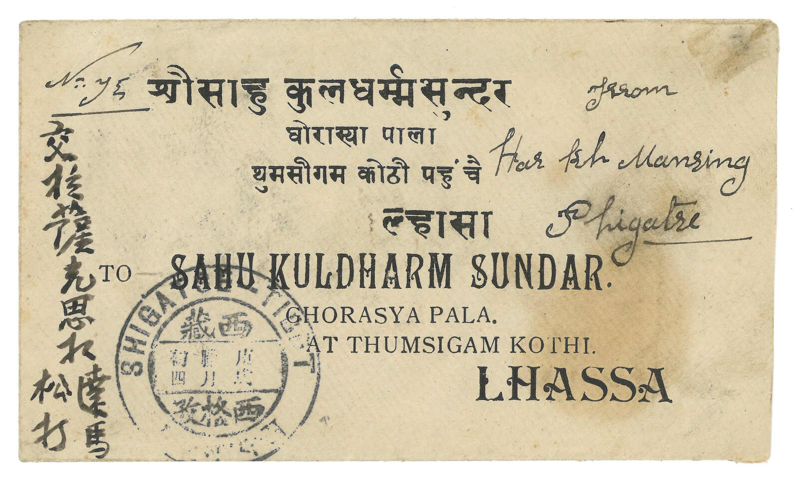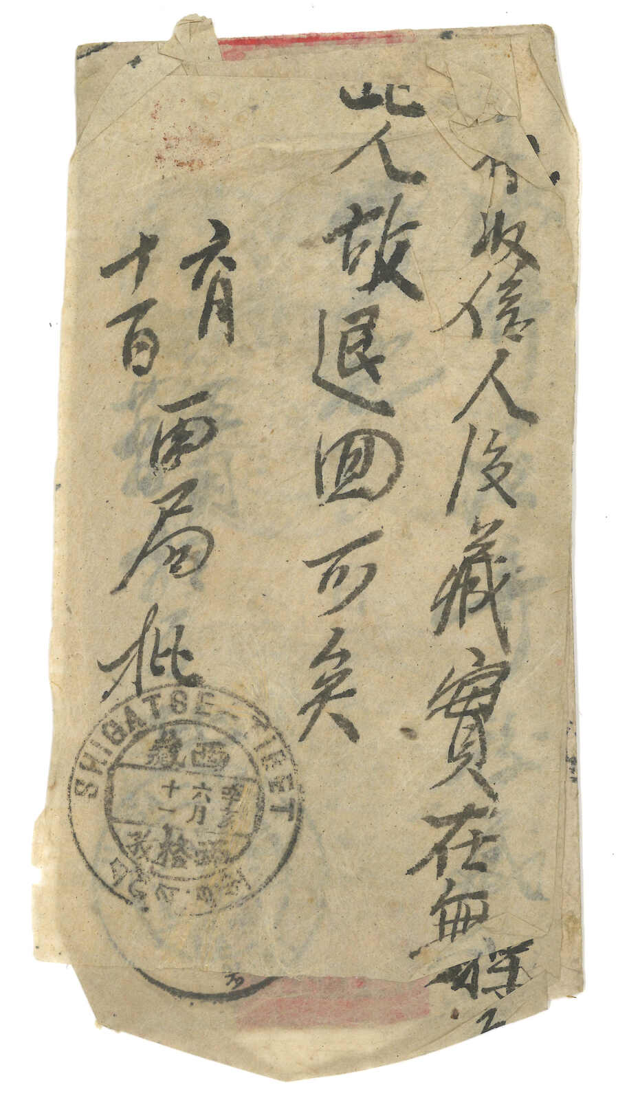 1032 cover image1911 Nekiang (30 Apr) to railway office, Lhasa. Red band cover, f.w. Coiling Dragon 10c, tied by Neikiang bilingual cds. Transit Chungking (2 May), Shanghai Chinese PO (May), Shanghai BPO (17 May), Hong Kong (22 May), Base Office (11 Jun), Gyantse. Arrived Lhasa (22 Jun). Redirected to Shigatse (29 Jun) with a directional slip. Addressee was still not found and return to sender with another slip. This cover was somehow not returned and was retrieved in the papers of S.W. Laden La. Very scarce redirected example from Szechuan to Tibet.