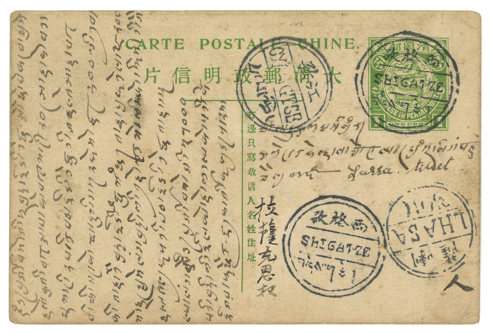 約1910年大清第四版郵資片自拉薩寄江孜,銷拉薩英漢藏C2型戳記。另鈐江孜英漢藏C1型到 達戳。王劍智及蔡盛著《青康藏郵驛史》記載,西藏清郵資片存世僅約十件,極為稀罕。(Image 1) (Image 2)