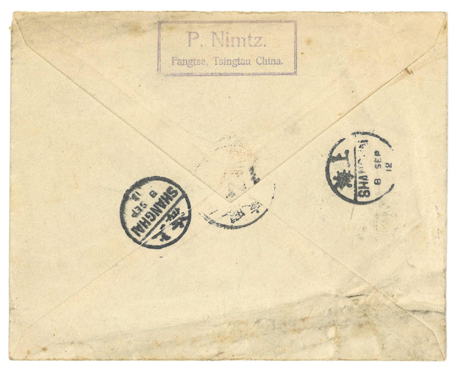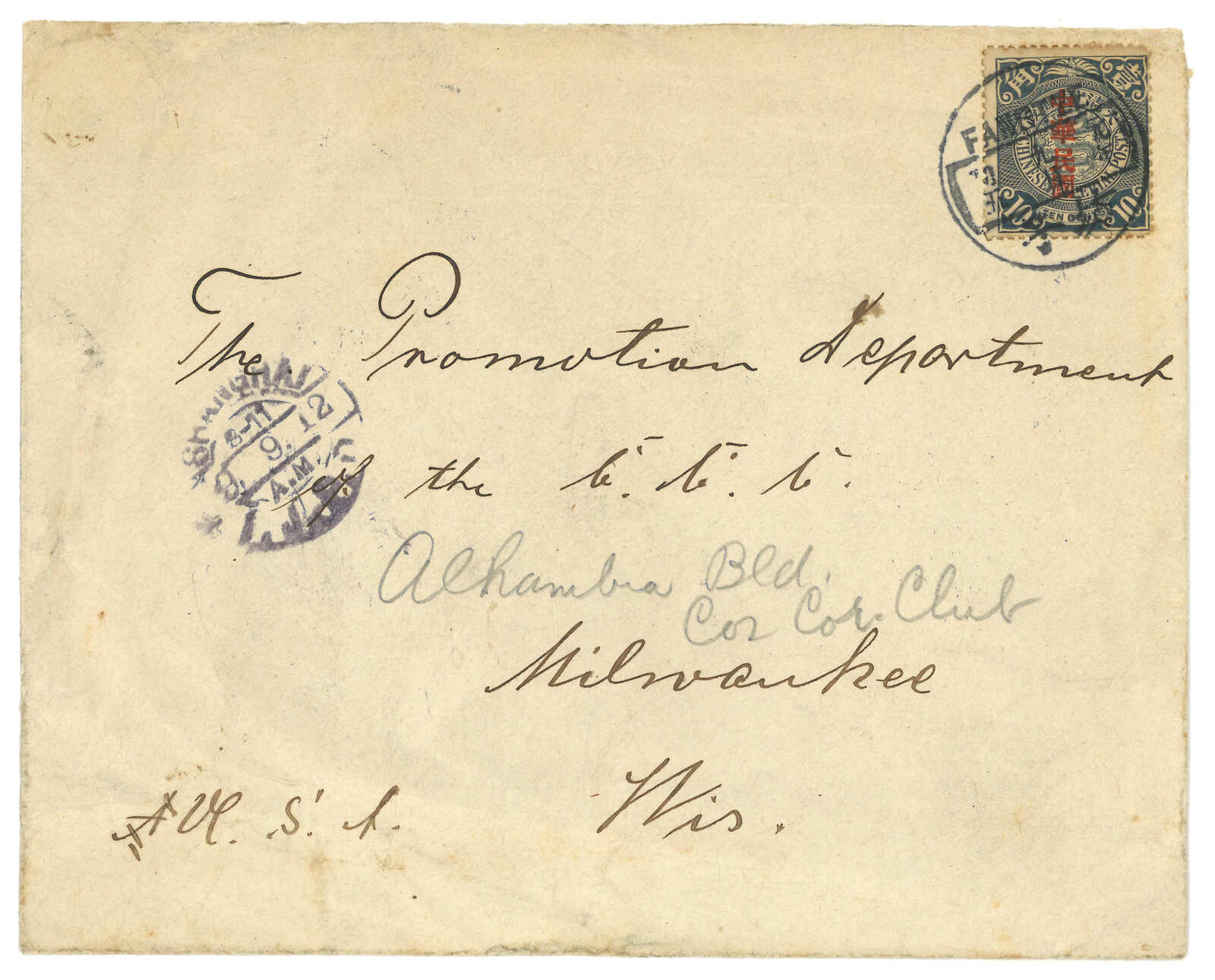 479 image1912 Fangtze (5 Sep) to USA, f.w. Coiling Dragon ovpt. ROC 10c, tied by Fangtze bilingual cds. Transit Kiaochow-Tsinan Railway, Shanghai Chinese PO (8 Sep), IJPO Shanghai (9 Sep). Although Imperial Post had to right to deliver mail bags by Kiaochow-Tsinan Railway, no Chinese railway psot office was established until the founding of ROC. Therefore it is a rather early example of Kiaochow-Tsinan Chinese TPO which was closed in 1914 due to WWI.