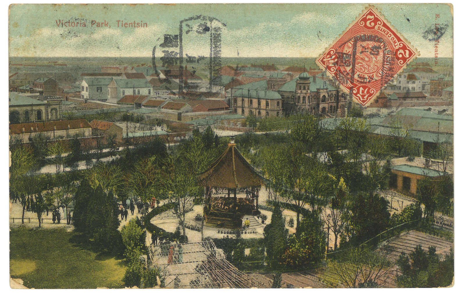 1908.10.2 山海關寄法國。天津風光彩色明信片,貼蟠龍2分,銷山海關腰框英漢日戳。經奉天,10.11經上海清郵,同月經上海法局。加貼法國欠資票10生丁,銷Puteaux 11.13日戳。(Image 1) (Image 2)