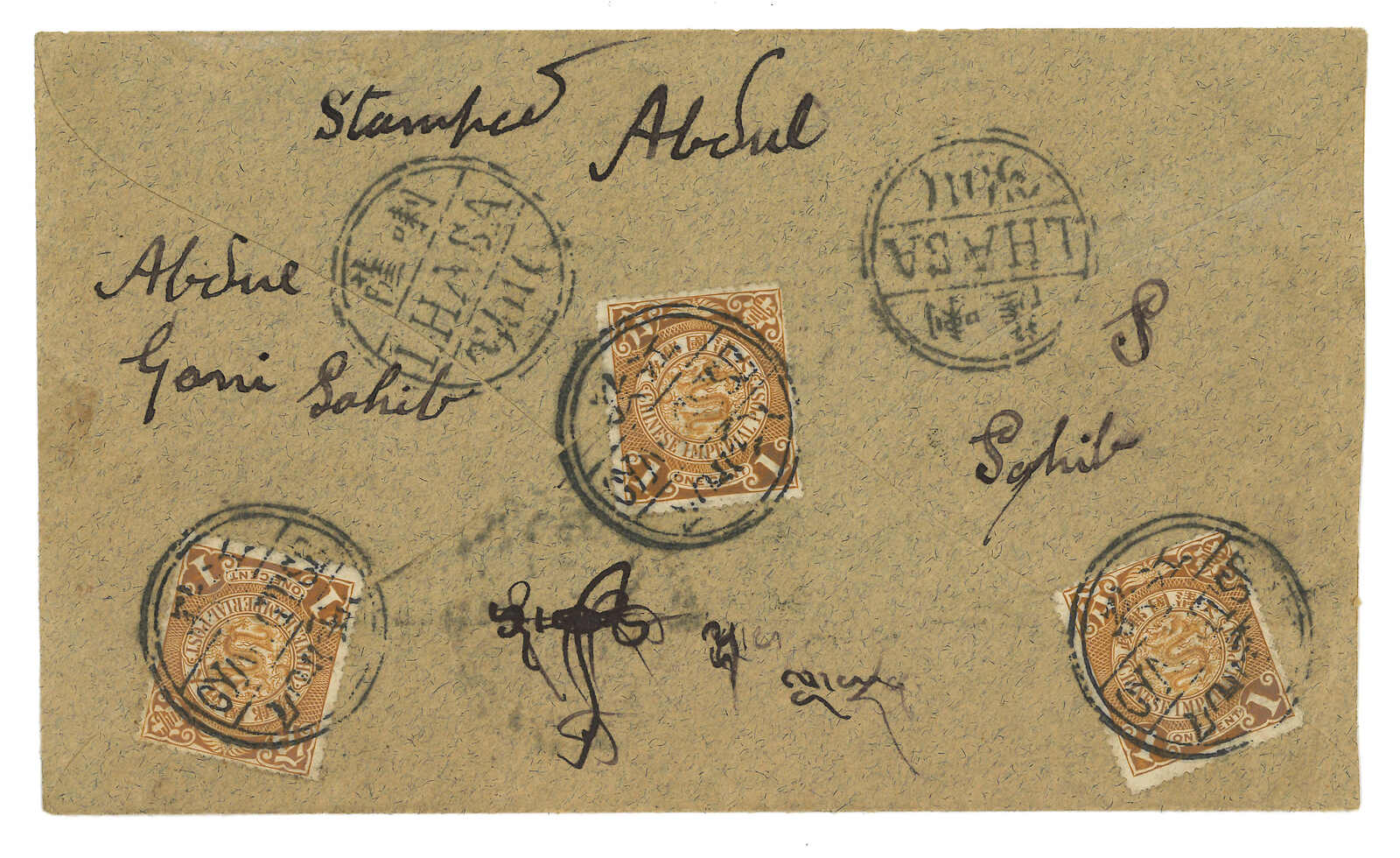 約1910年江孜寄拉薩,背貼蟠龍3x 1分,銷珍罕之江孜C1型漢藏英文戳記。抵拉薩,鈐同樣少見之拉薩C1型到達戳。郵戳清晰精彩。(Image 1) (Image 2)