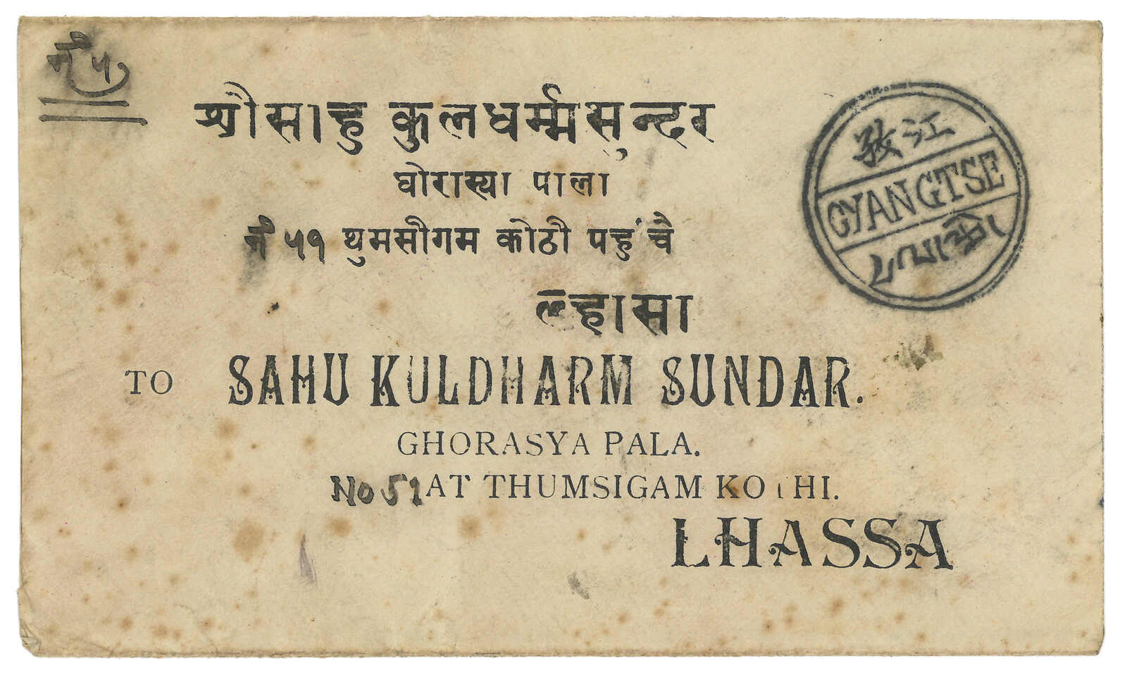 1043 cover imageca 1910 Imperial 4th Print PSC from Lhasa to Gyantse, tied by Lhasa type C2 trilingual h.s., alongside with Gyantse type C1 trilingual arrival h.s. According to “Tibet Stamps and Postal History” by Steve Chazen and Danny Wong, only about 10 Imperial stationery cards from Tibet exist. Extremely scarce.