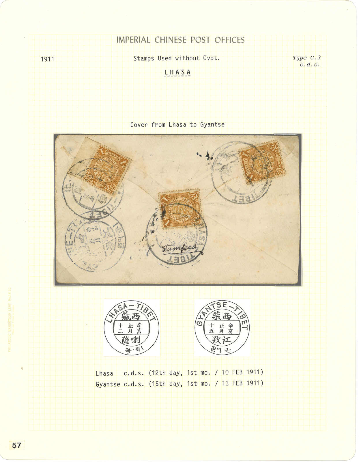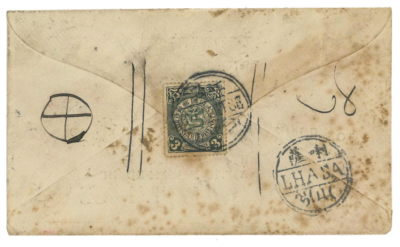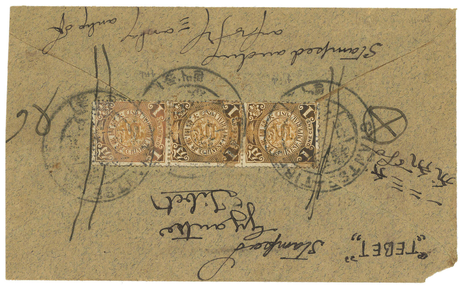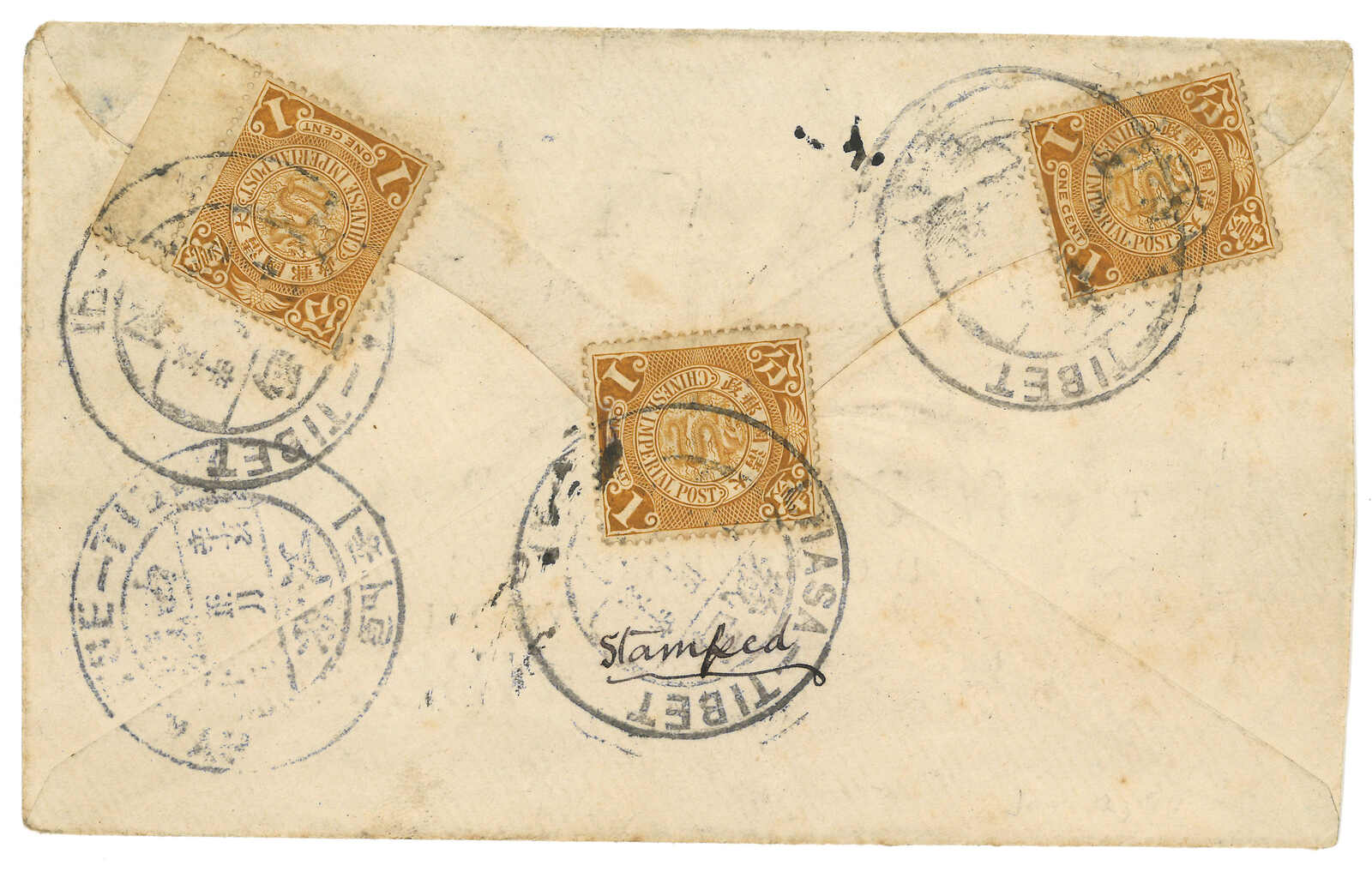 1911.2.10 拉薩寄江孜,背貼蟠龍3x 1分,銷拉薩大圓戳。2.13抵江孜,同樣鈐大圓戳。Charles Dougan舊藏。 2002年10月斯賓克“Meiso Mizuhara The Exhibition Collections”拍品號49。(Image 1) (Image 2) (Image 3)