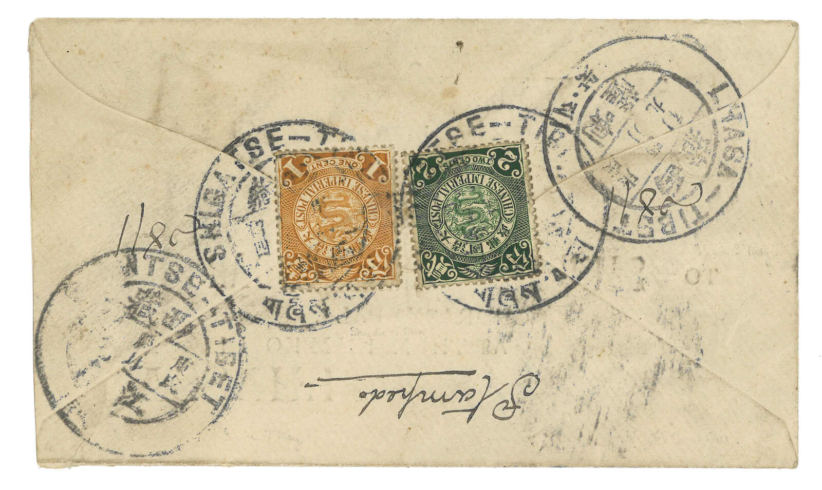 約1910年江孜寄拉薩,背貼蟠龍3分,銷珍罕之江孜C1型漢藏英文戳記,正面另鈐相同戳記。抵拉薩,鈐拉薩C1型到達戳。郵戳清晰精彩。(Image 1) (Image 2)