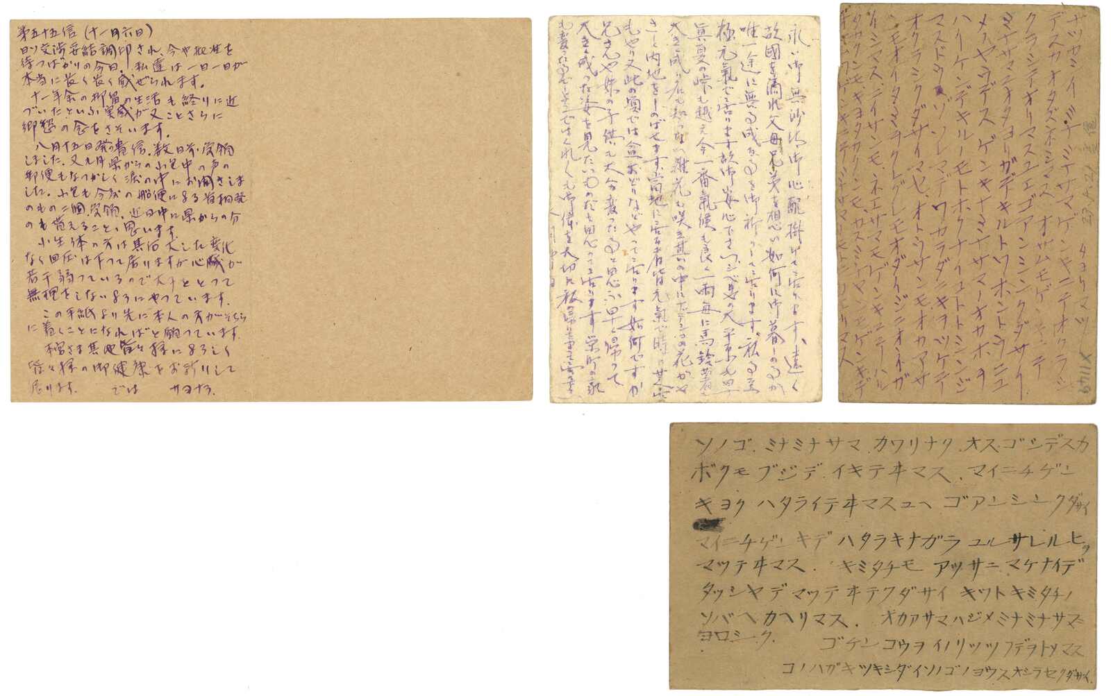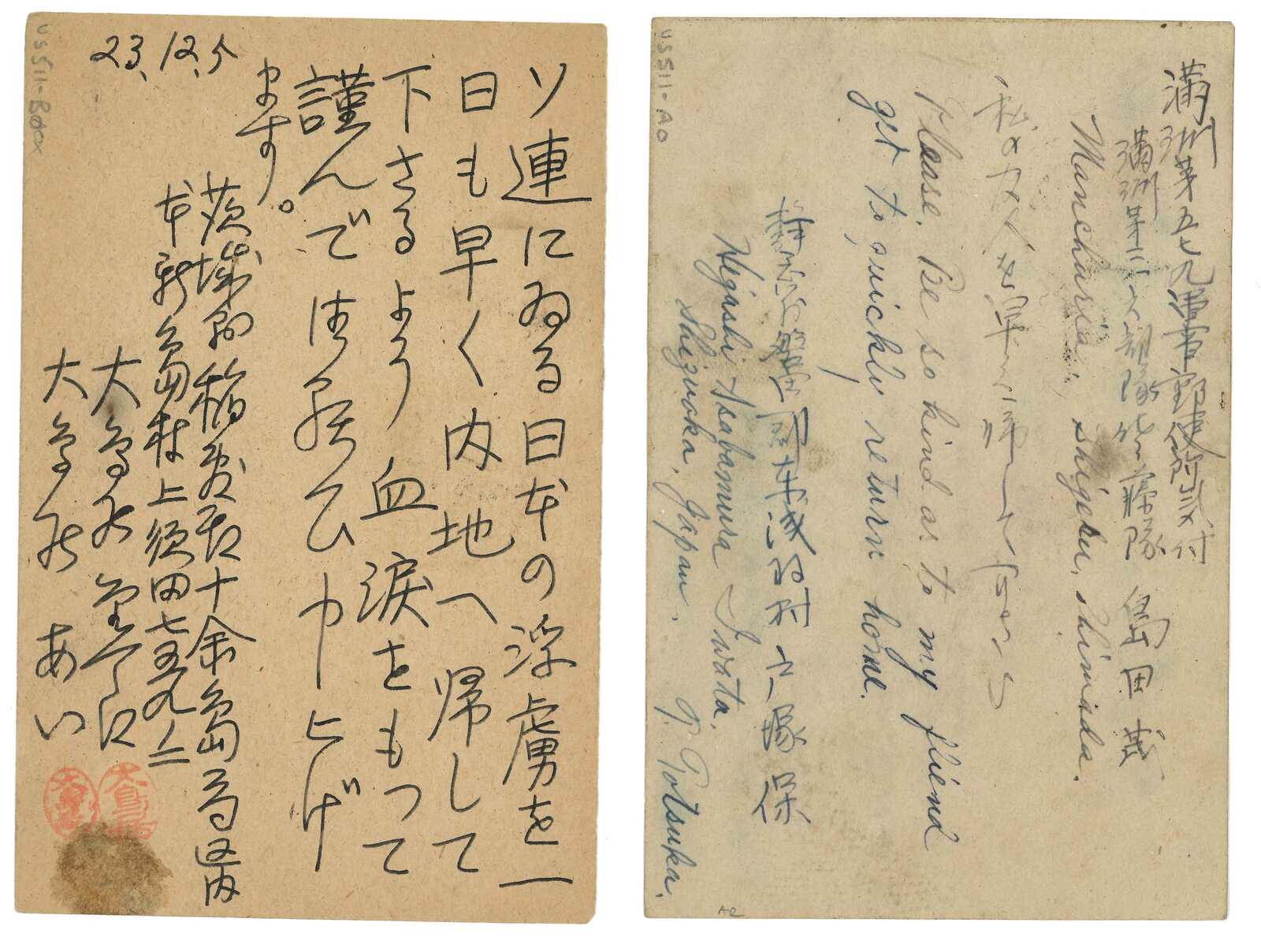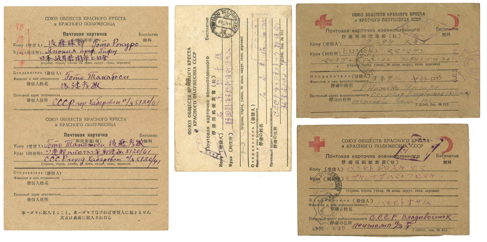 1945至1948年一組四件日軍戰俘明信片,分別自海參崴及伯力寄出,均無貼票,鈐有俄國日戳及檢查章等。(Image 1) (Image 2)