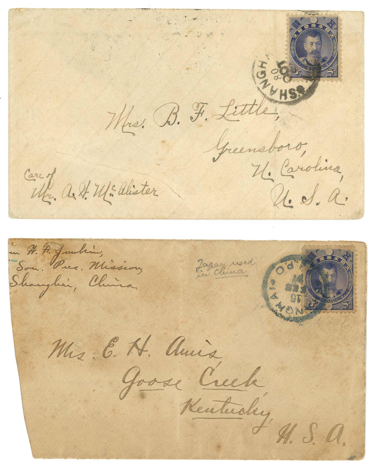 2380 cover image1896 and 1897 a pair of covers from IJPO Shanghai to USA, f.w. Victory in Sino-Japanese War 5c, tied by IJPO Shanghai cds. Transit Yokohama. Alongside with USA transit and arrival cds. Scarce franking in IJPO.