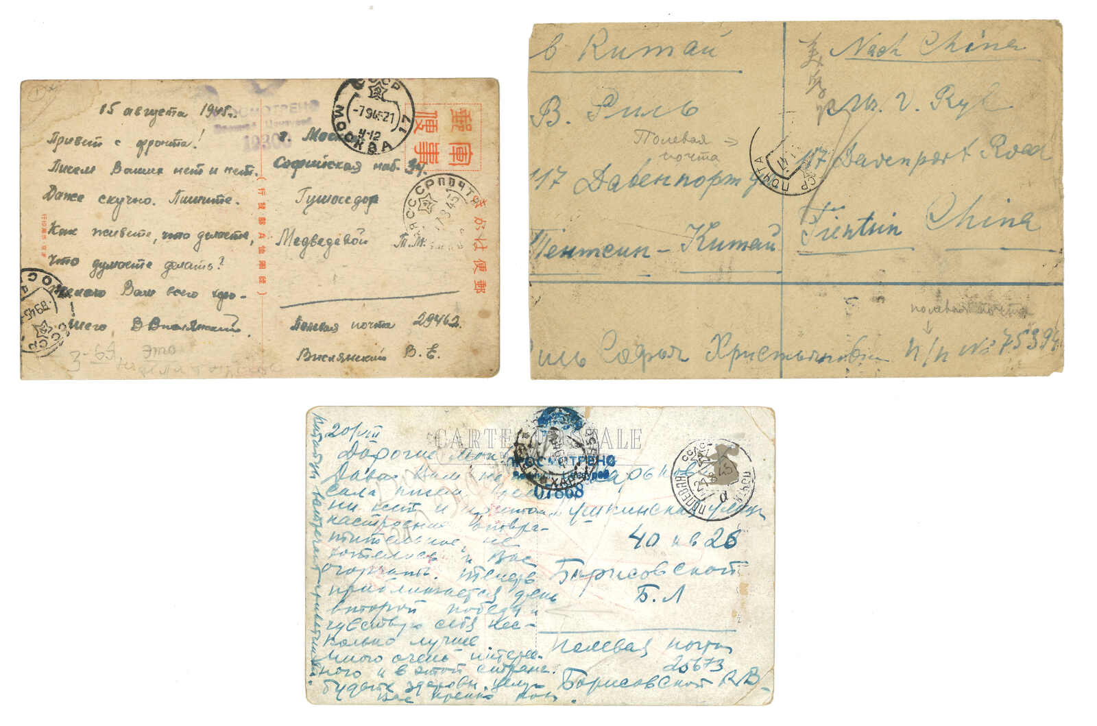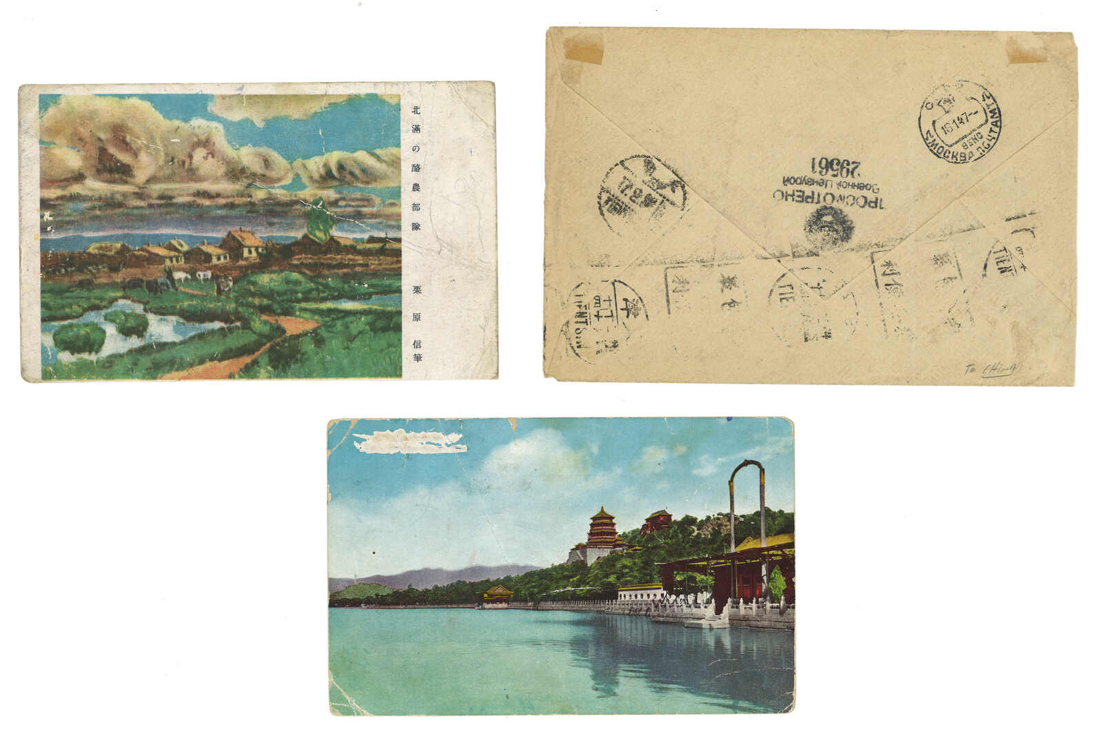 1945至1947年一組三件蘇軍野戰軍郵局封片,無貼票,均鈐“Pochta Polevaya CCCP”日戳,旁帶檢查章。當中兩件明信片於日軍投降不久後寄出。Robert Farquhar舊藏。2016年6月Interasia Auctions拍品號1214及1215。(Image 1) (Image 2)