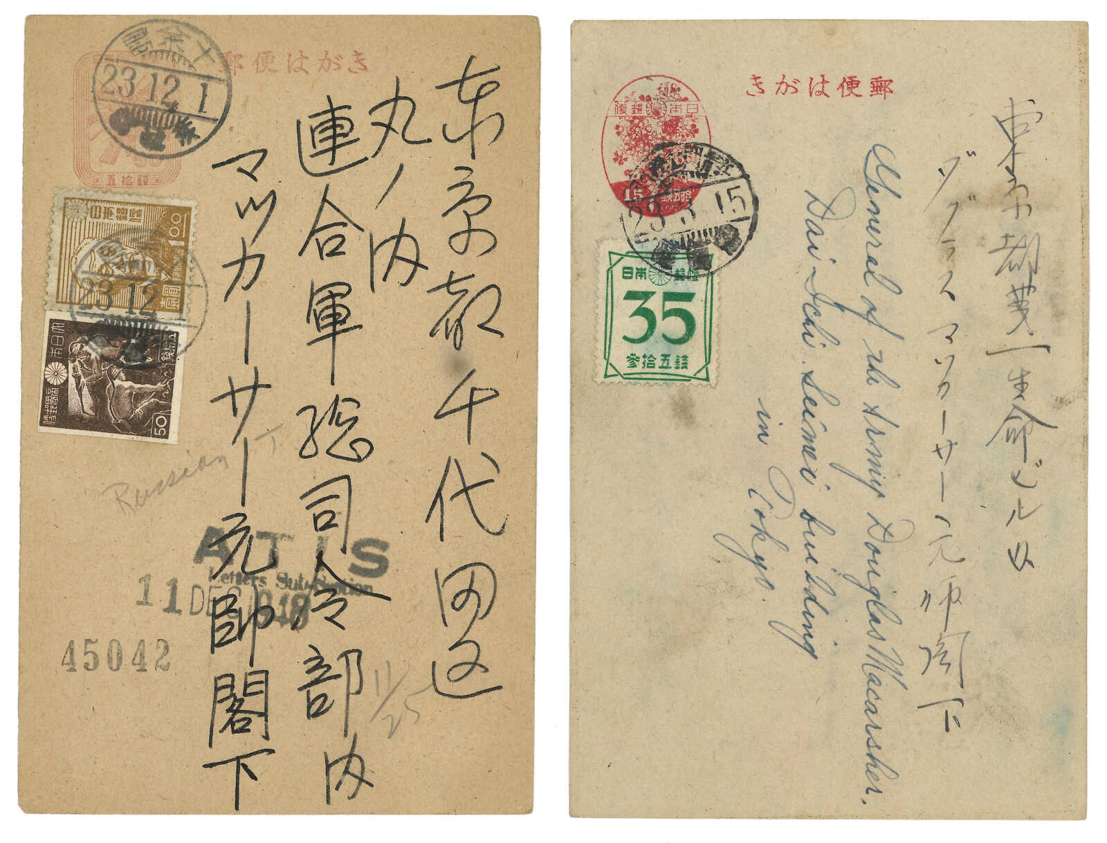 1948年一對寄麥克阿瑟將軍之日本郵資片,加貼日本票。寄傳奇美軍將領之難得郵例。(Image 1) (Image 2)