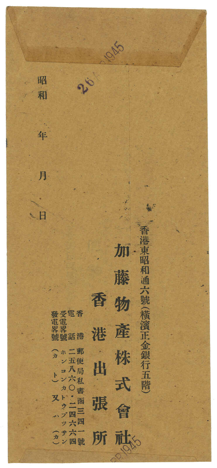 1659 cover image1945 (13 Jan) Japanese 2s stationery card (Yang JPC1) to Canton, uprated with 1s, tied by Hong Kong Japanese style cds. Arrived Canton (16 Jan). Example of 3s local postcard rate.
