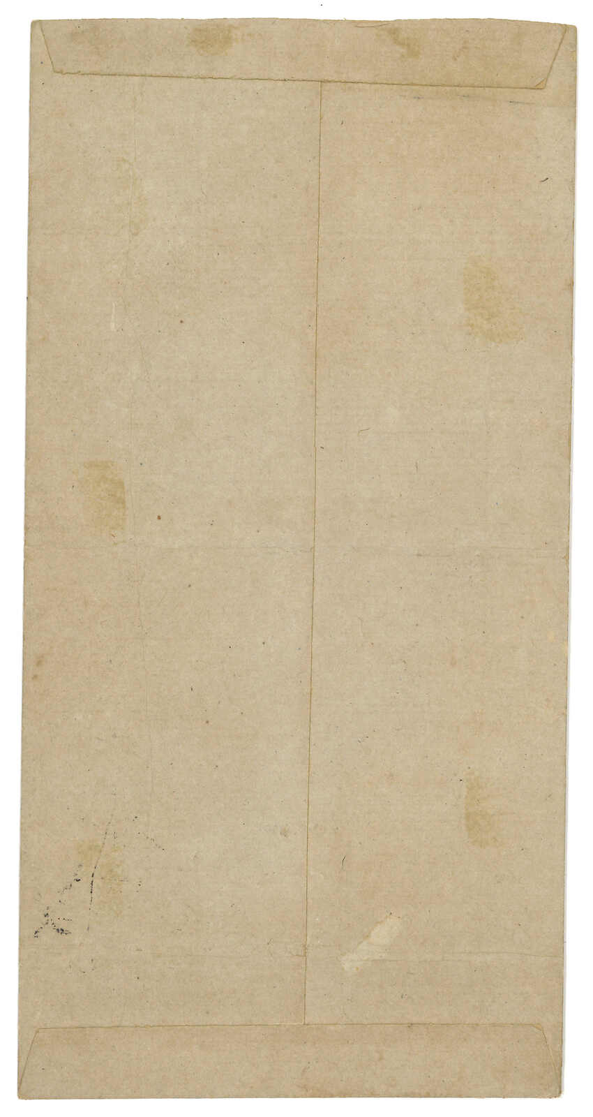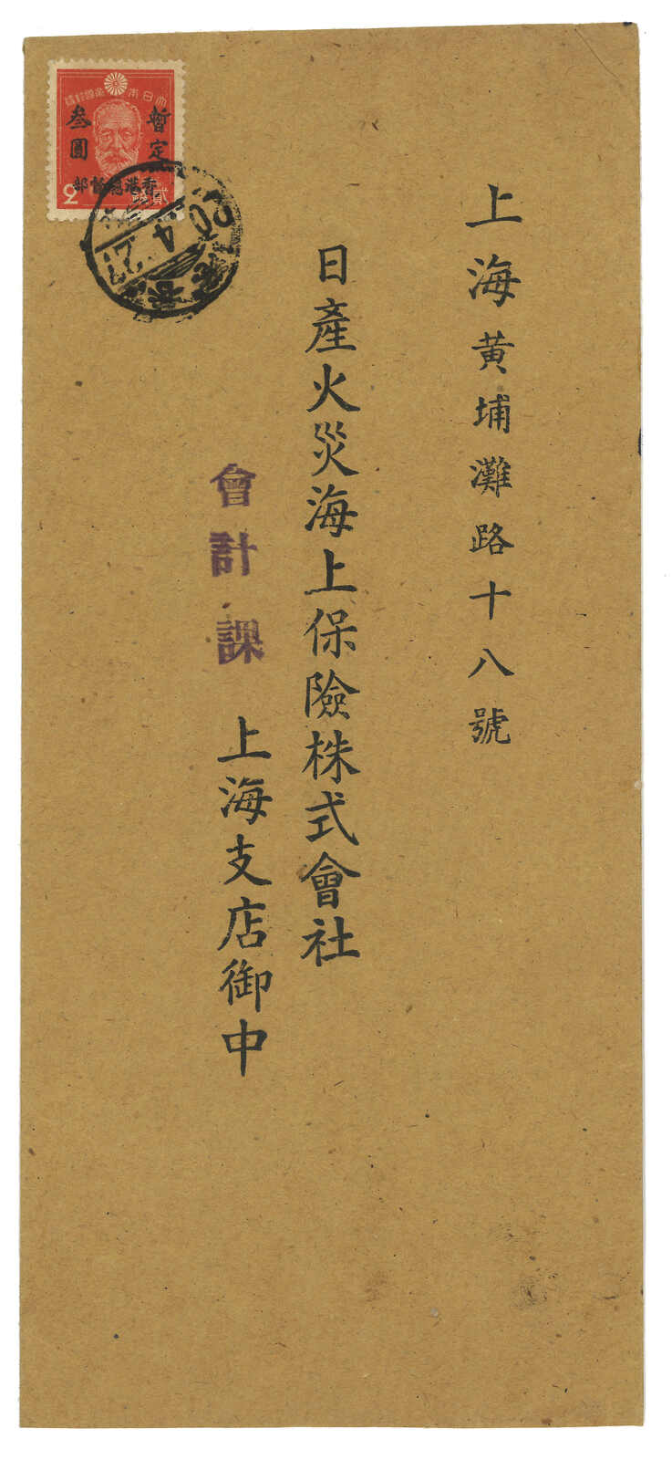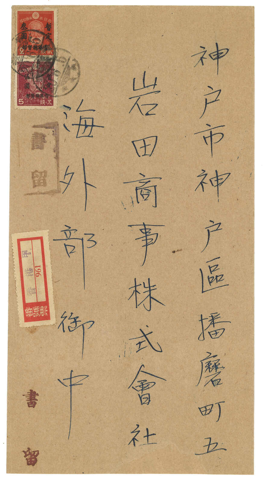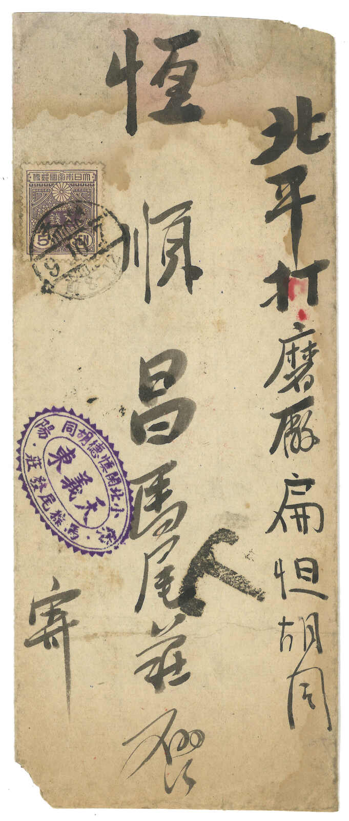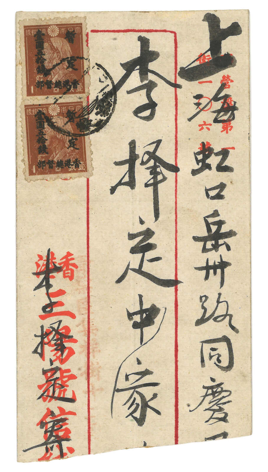 434 cover image1945 Swatow (14 Sep) to Hingning. Chinese style cover, f.w. Swatow surcharge "Temporarily Sold" $400 on Martyrs 1c (Chan JK58), tied by Swatow bilingual cds. Since the victory of WWII, the puppet regime collapsed and the banknotes of Central Reserve Bank became invalid. However, the PO in Swatow was short of postage stamp and therefore issued surcharge stamps in unit of Central Reserve Bank banknotes. Covers franked with this stamp are very scarce. 2019 (Jul) John Bull "Fukui Kazuo's Collection of Japanese Occupation of China Stamps and Postal History", lot 7075. Ex- Meiso Mizuhara.