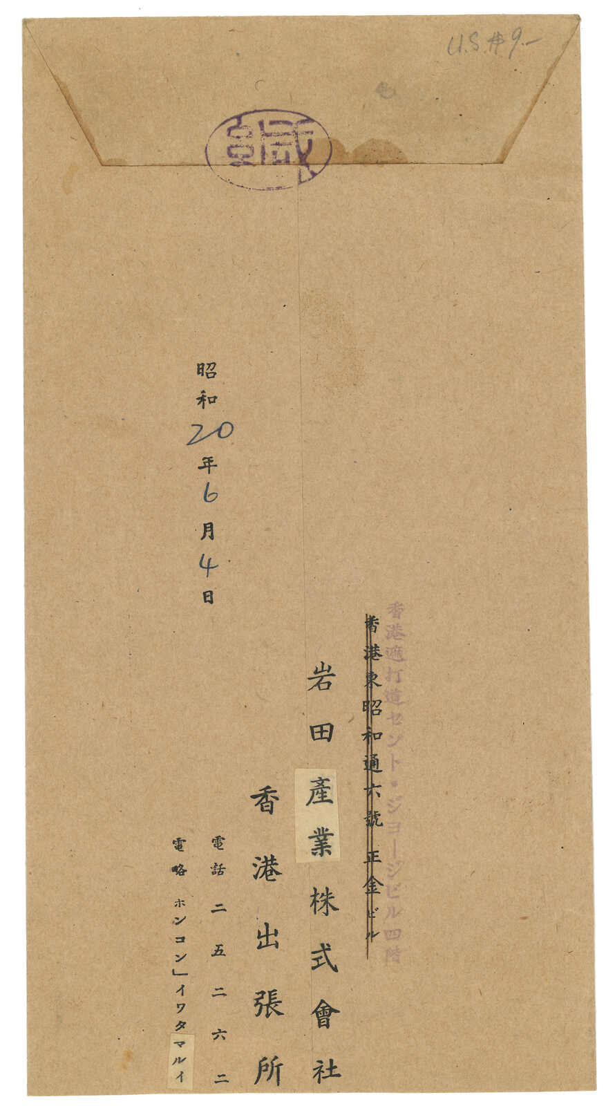 1944.9.17 未加蓋日本票1錢 + 2錢貼於航空封上,銷九龍日式戳。(Image 1) (Image 2)