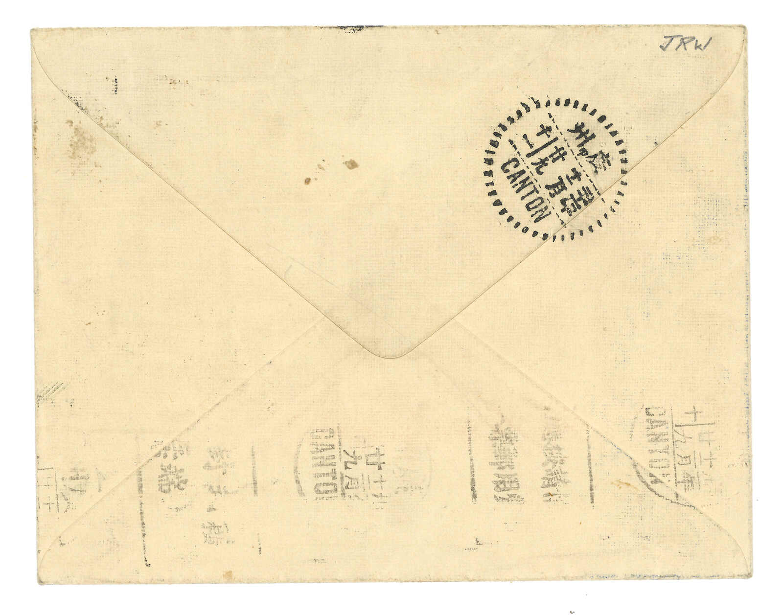 433 cover image1945 (19 Jul) Swiss Consulate Canton cover to Hong Kong, f.w. Kwangtung surch "Temporarily Sold" $200 on SYS 30c in pair (Chan JK56), tied by Canton bilingual cds., along with "OFFICIAL MAIL" cachet. Adhesive was framed by crayon with "0.70" annotation. As Japanese troops were close to failure by that time. Transportation between Shanghai and Kwangtung was interrupted. PO in Kwangtung was short of stamps and therefore issued surch stamps on 6 Jul. Commercial usage is very rare.