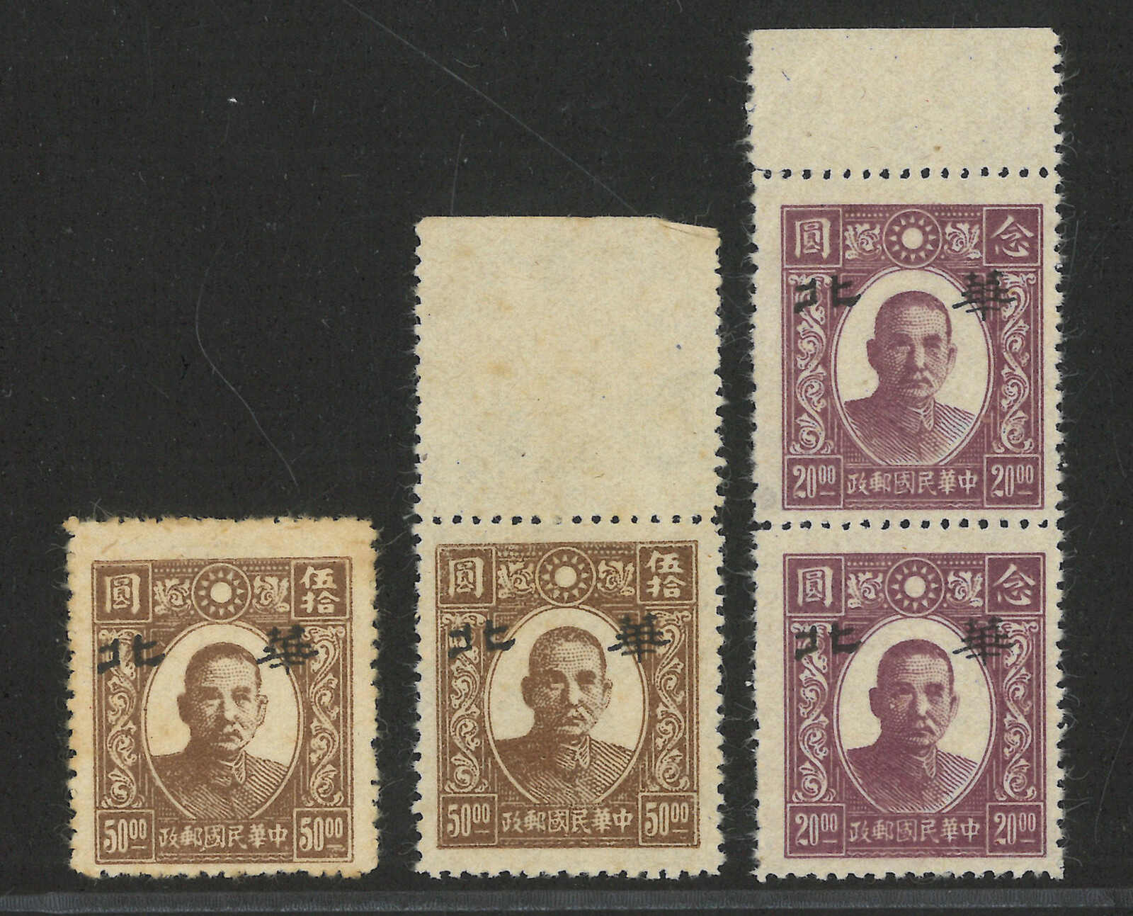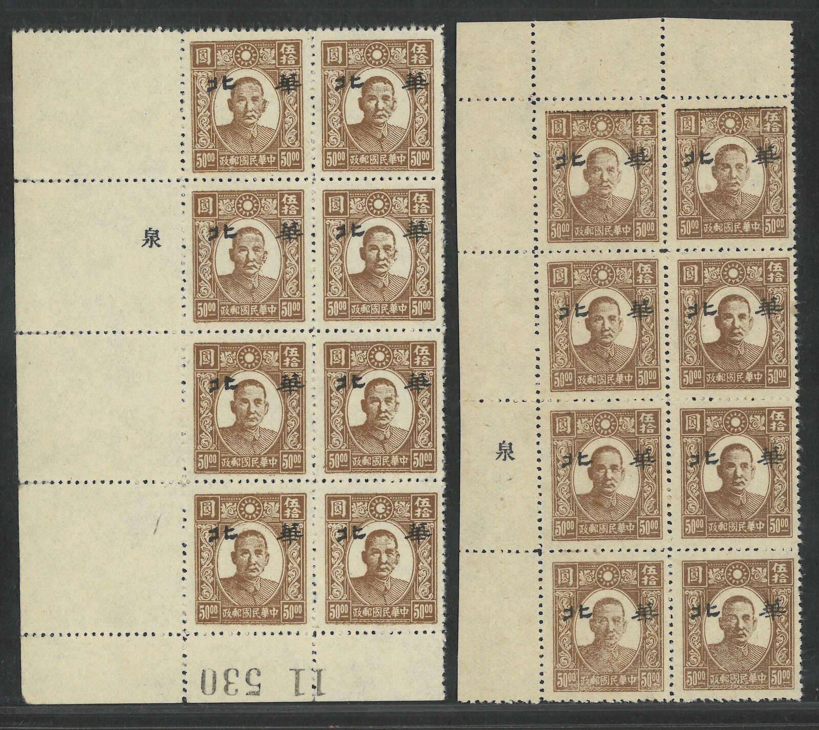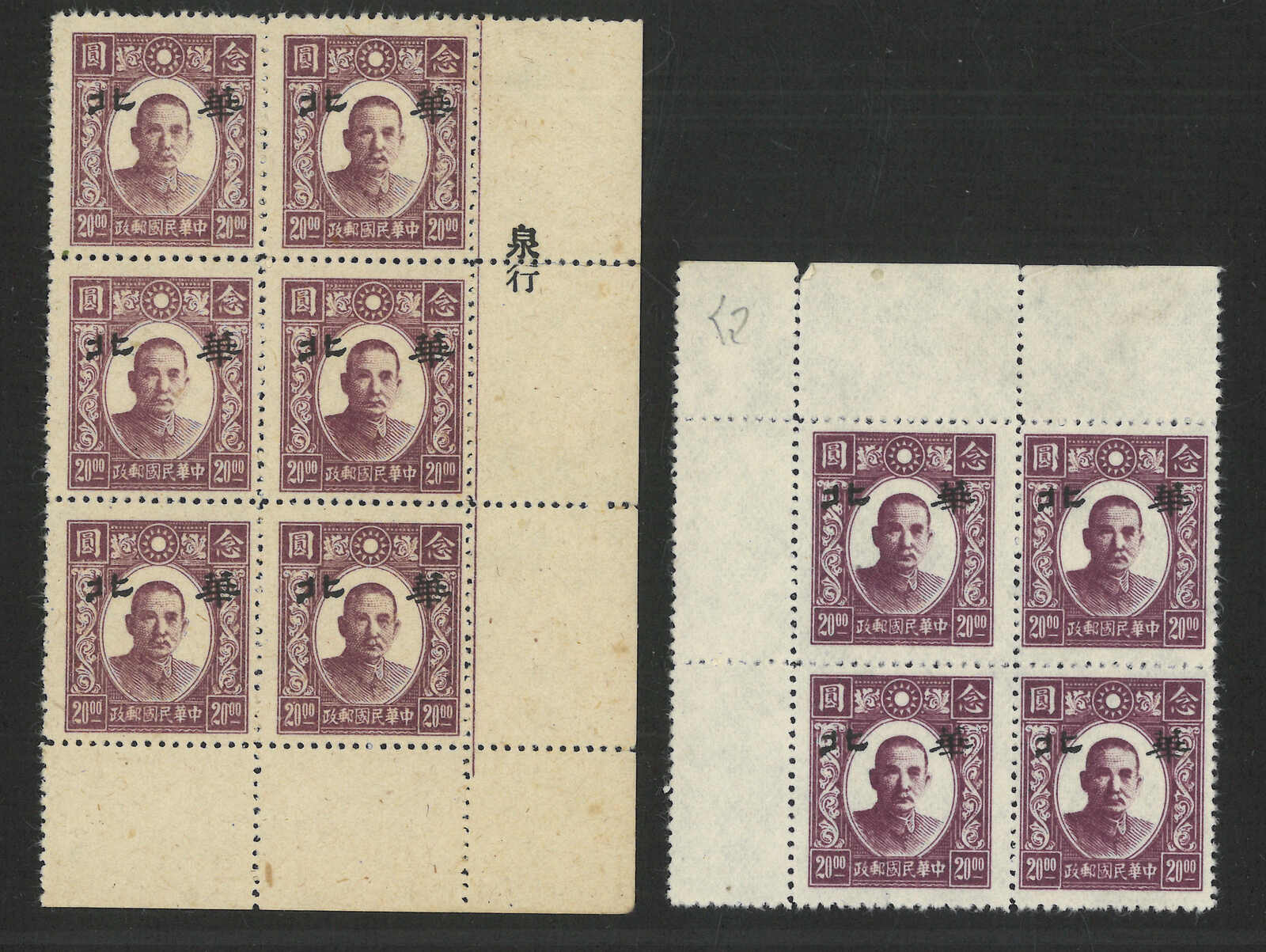 1945年一組極為龐大之新民版孫像加蓋華北票,數量達成百上千,包含新舊票單枚、方連及版票。高面值之20元及50元亦包括至少十來件方連。請預覽。(Image 1) (Image 2) (Image 3)