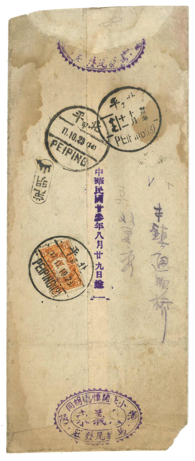 1934.10.7 奉天寄北京,貼日本票5錢,銷奉天日本客郵局日戳。10.11抵北平,加貼民國欠資票5分。按中日郵政協定,由南滿鐵路附屬地日本客郵局寄出、貼日本郵票之郵件,另需貼中國郵票才能寄至中國內地,否則將被判為欠資。日方對此不滿,指華滿通郵前中日兩國概不徵收欠資。詳見何輝慶著《1934華滿通郵談判暨相關郵史》。(Image 1) (Image 2)