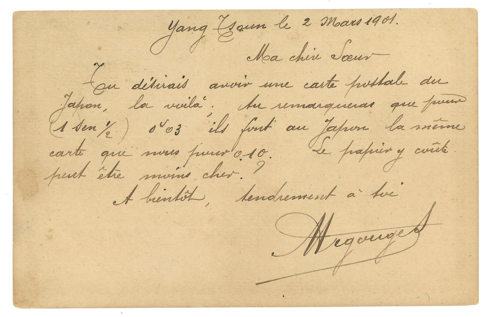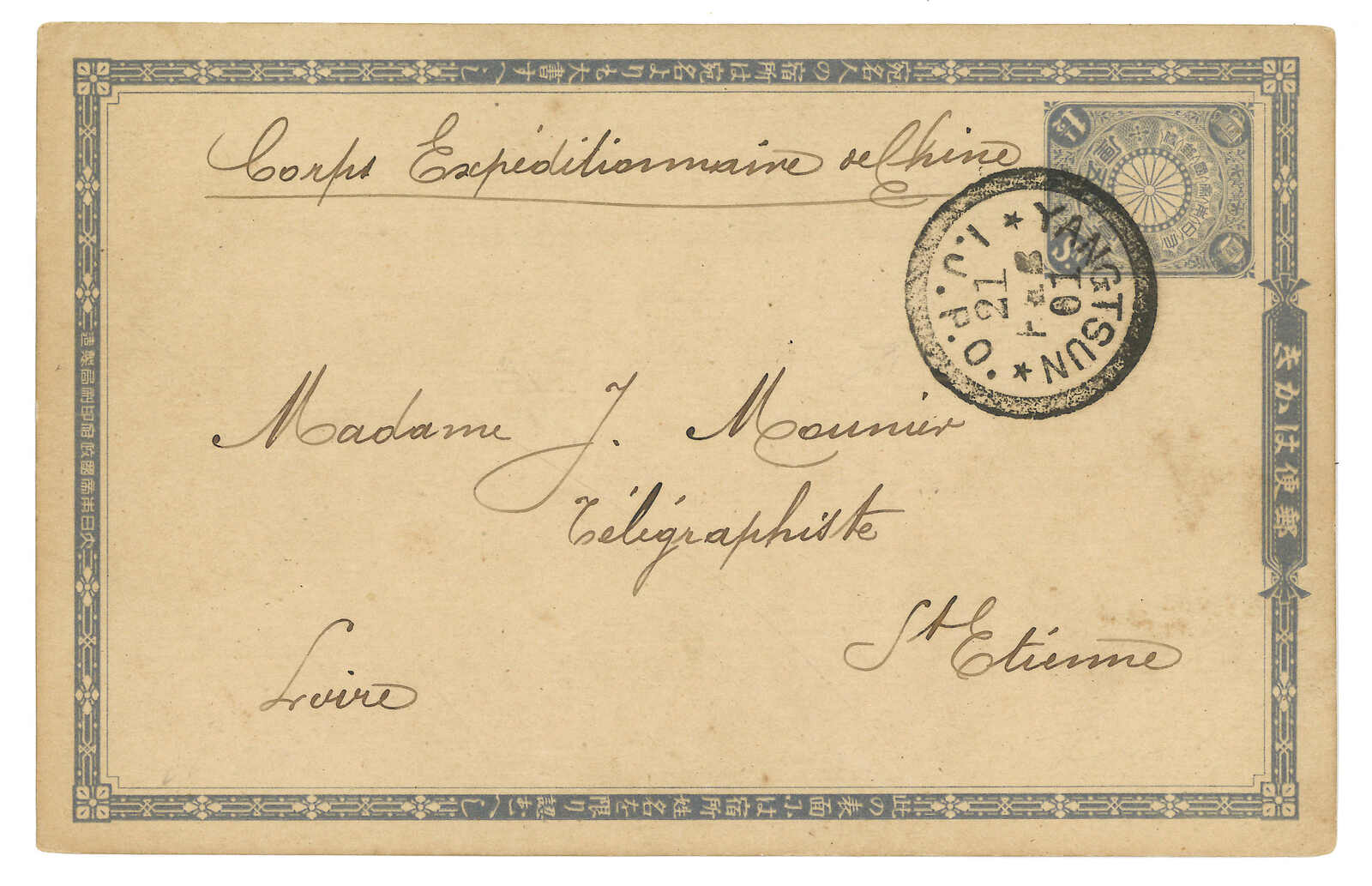2382 cover image1901 (21 Feb) Japanese 1-1/2s PSC used by Corps Expeditionaire de Chine, Yangtsun, to France, applied with scarce IJPO Yangtsun cds with inverted date variety. This cds was only recorded between 10 Sep 1900 to 17 Jul 1901.