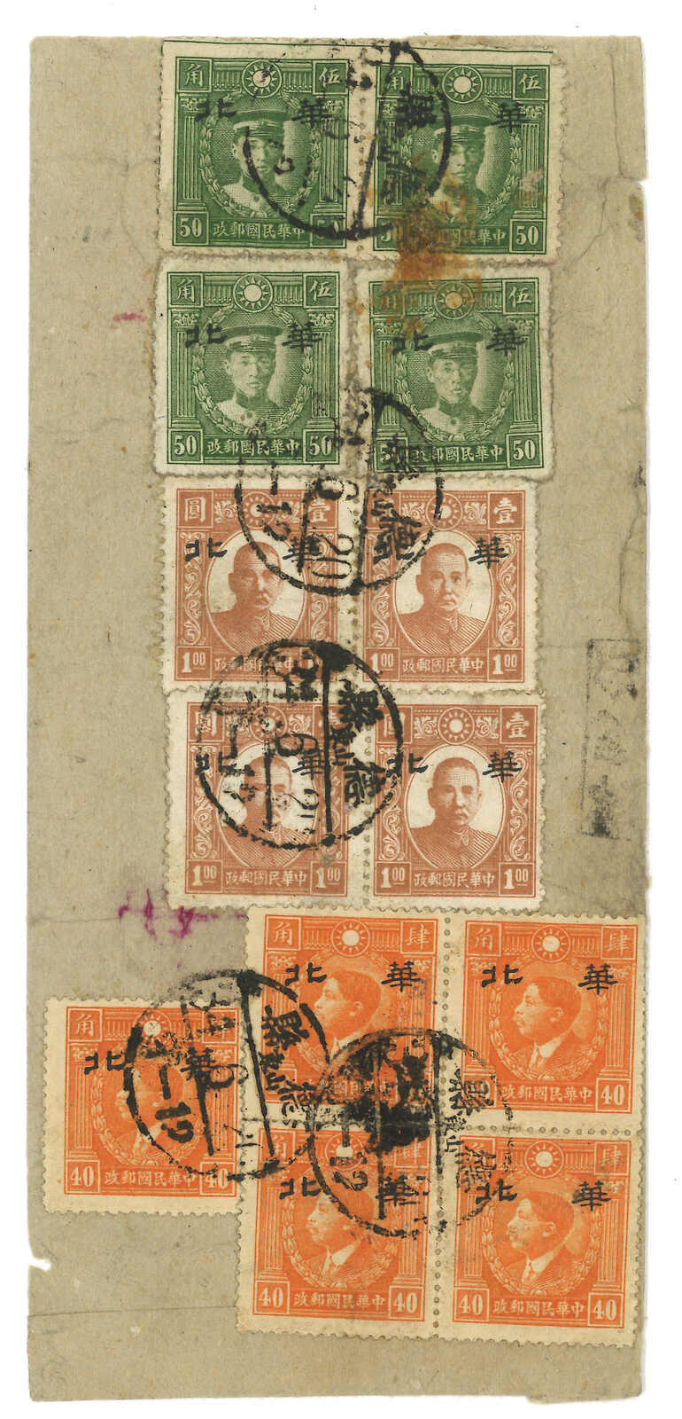1945.6.20 德縣寄北京,背貼仿版烈士加蓋華北4角x4 + 5角x4 + 新民版孫像加蓋華北1元x4,銷山東德縣日式日戳。(Image 1) (Image 2)
