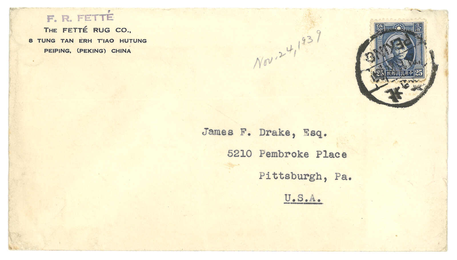 1939.11.24 北平寄美國,貼倫敦版孫像2角5分,銷北京三格英漢日戳(以阿拉伯數字紀年)。日佔下的北京郵局使用了阿拉伯數字紀年的日戳,與國統區之郵局不同。(Image 1) (Image 2)