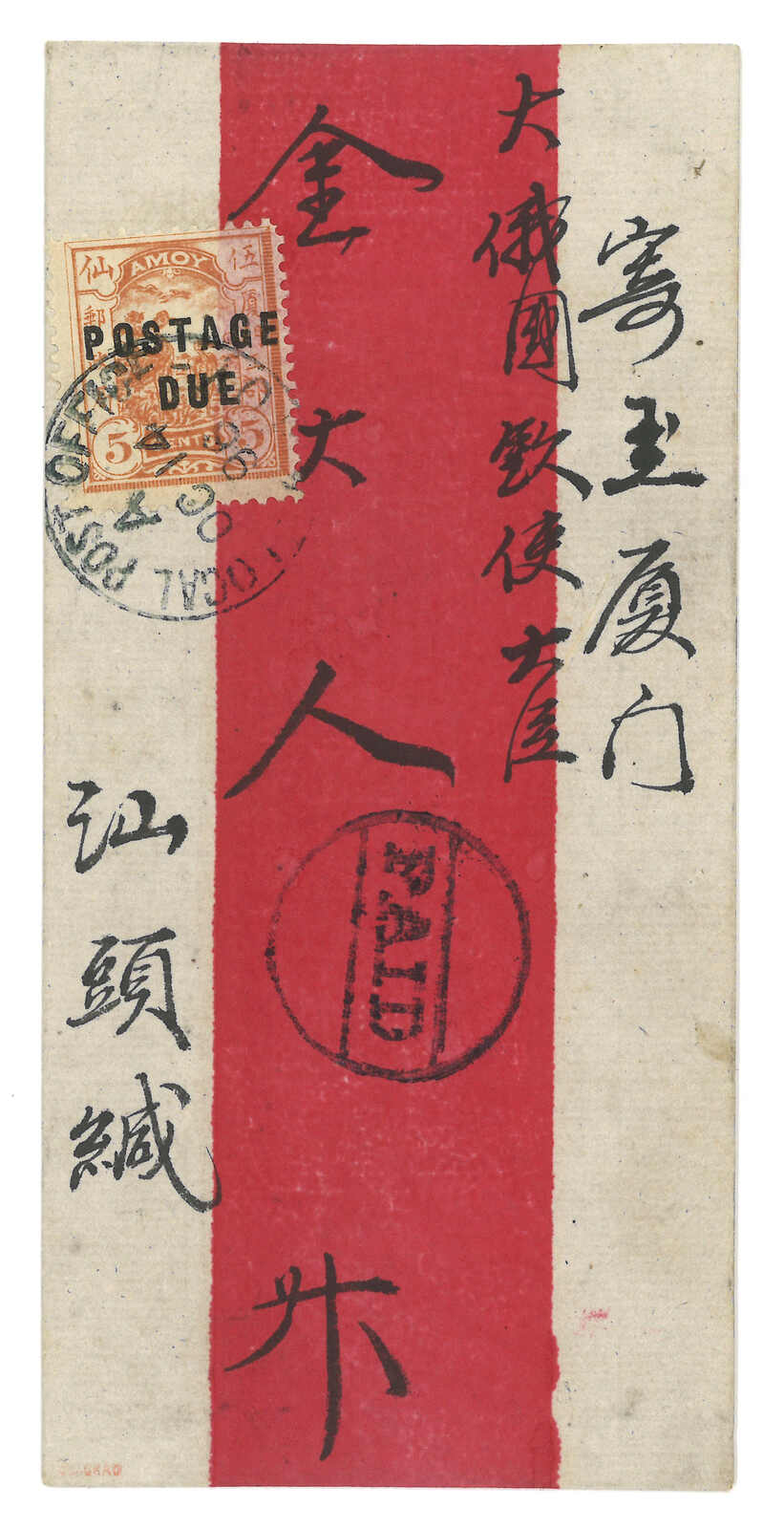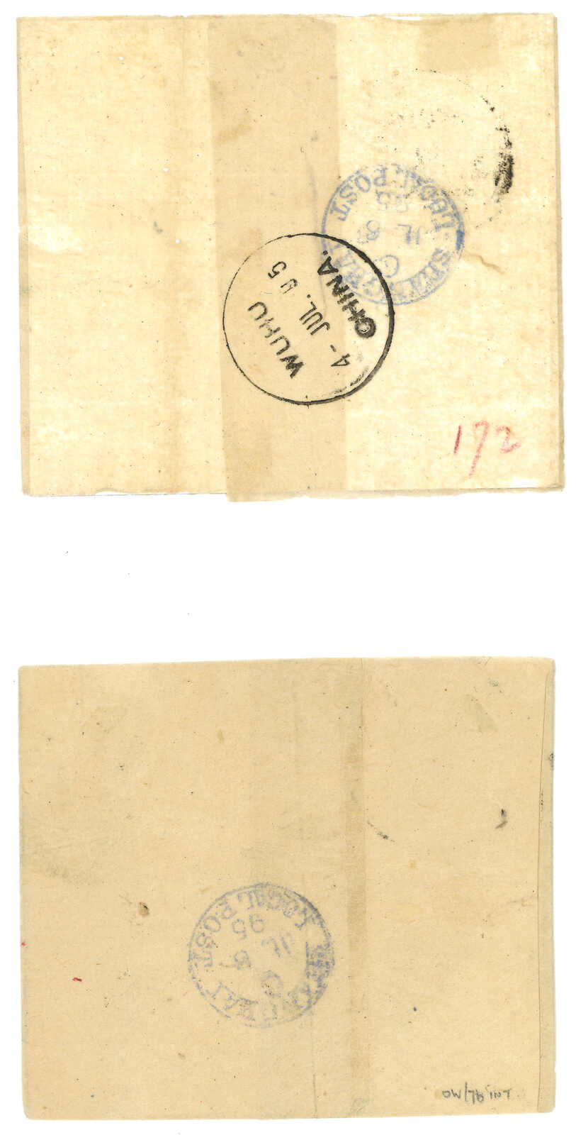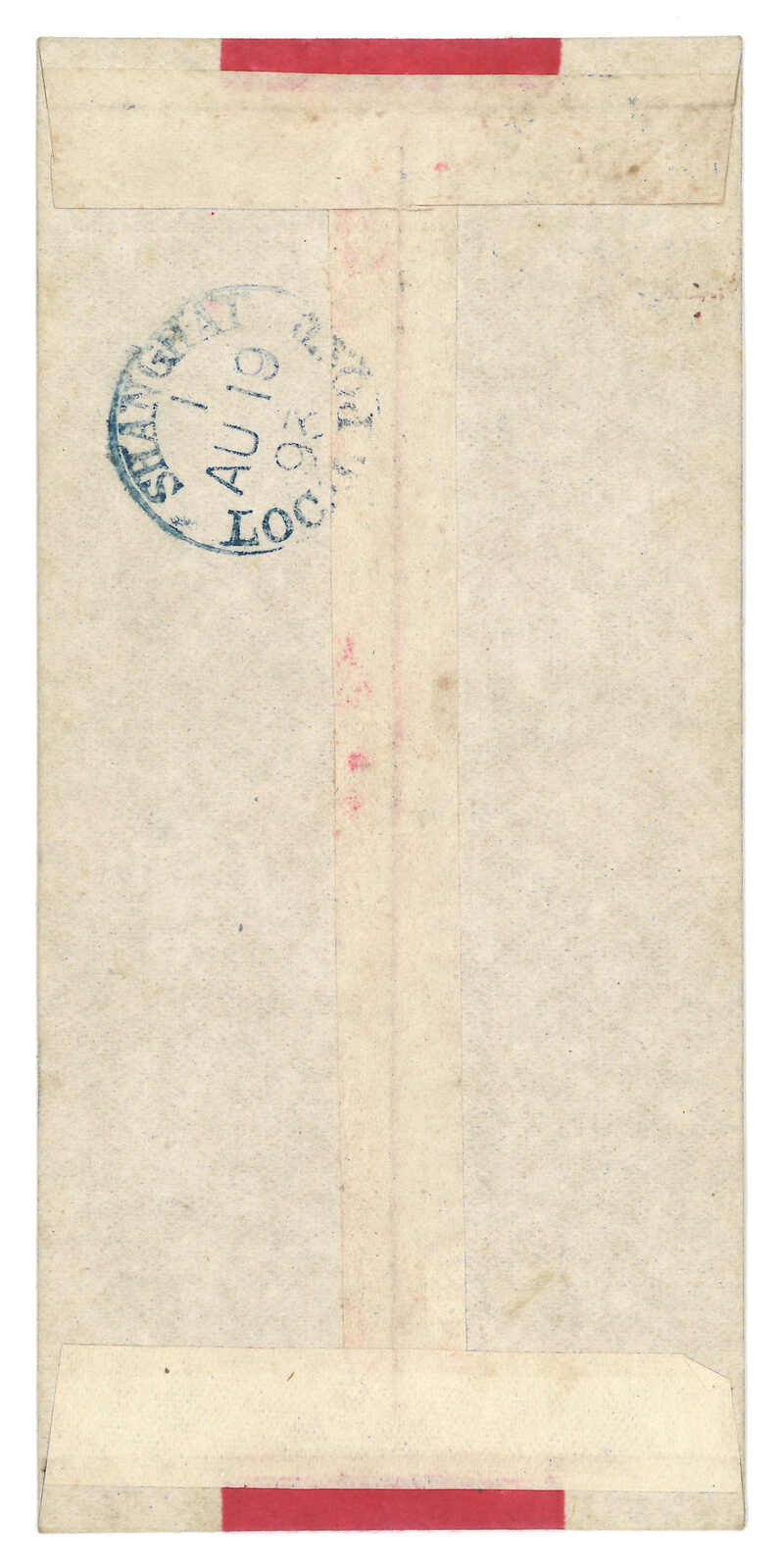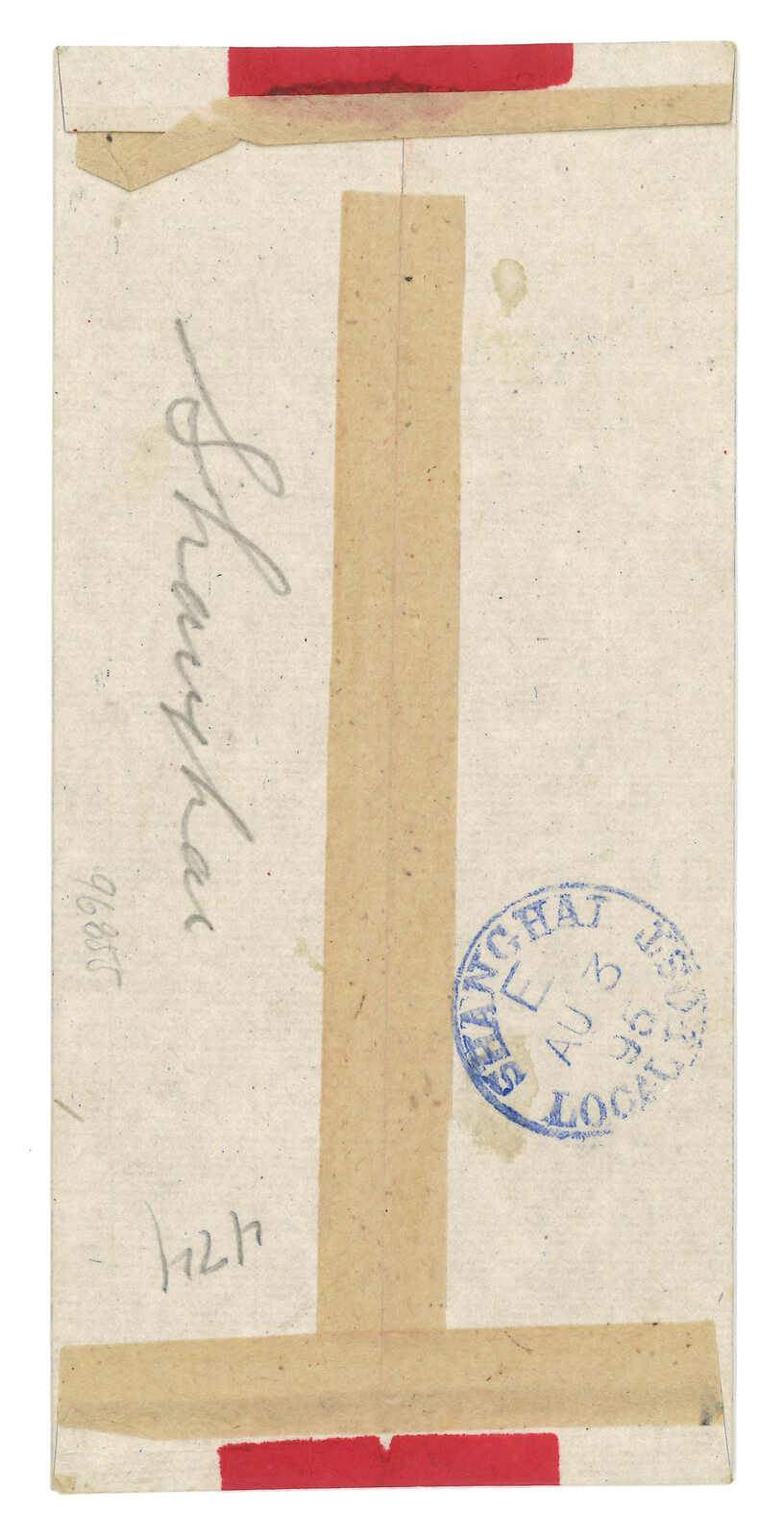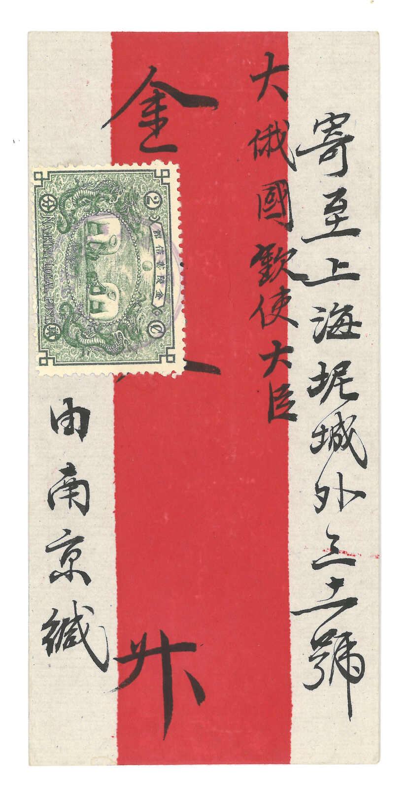 48 cover image1882 Tientsin (14 Jul) to the Peking Office of the Viceroy of Chihli. Red band cover, f.w. Large Dragon wide margin 3ca brown red (setting VI or VII) + 5ca pale yellow-ochre in horizontal strip of 4 (setting III, pos. 6-20-13-14) and 5 (full row of 7-5-4-12-8) on reverse, 16 times base rate, tied by multiple oval Tientsin type 1 seal, showing “Customs/Tientsin” double-ring d.s. and framed Chinese datestamp of the Tientsin Customs. Very fine and an exceptional internal franking, only one other cover has been recorded with as many examples of the wide margin 5candarins. A wonderful exhibition item of the highest calibre. Opened out for display. Note: There are approximately 8-10 covers recorded from the “Po Shu Ta Chu” (Post Office), which had taken over the functions of the defunct Hwa Yang Shu Hsin Kuan following its closure in 1882. The majority of covers known are either from the Starr collection or in the Chinese National Postage Stamp Museum. Since the “Po Shu Ta Chu” operated under the direct management of the Tientsin Customs, their mail had stamps affixed. All these covers were between July-December, 1882. Provenance: Starr (Sotheby’s, 12-13 September 1991, ot 303, realized GBP40,700). Siegel Auctions, 23 April 1996, lot 31. Illustrated as plate 147 on p. 253-254 in “A Comprehensive Illustration on Covers of Chinese Large Dragons” by James B. Whang. Cf. Lisa and Sven Beckeman, “Large Dragons on Red Band Covers, Journal of Chinese Philately, No. 280, Vol. 39, No.5, pp. 113-115 Holcombe believed it is genuine, with his 1996 certificate and two-page opinion. RPSL certificate of 2004 stated that “stamps show evidence of being attached to cover subsequent to posting and did not originate on cover”. Photocopies of the certificates are attached. As expert opinions are divided, buyers should exercise caution. We would not be in position to assist in obtaining further certificates nor accept return and refund for this lot.