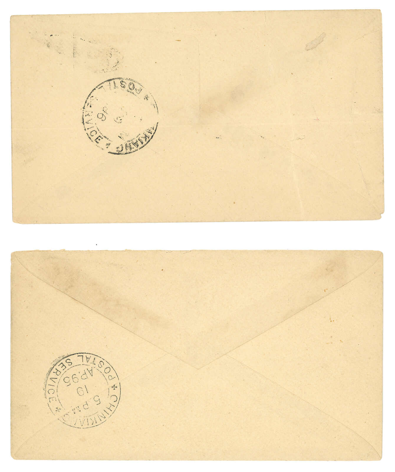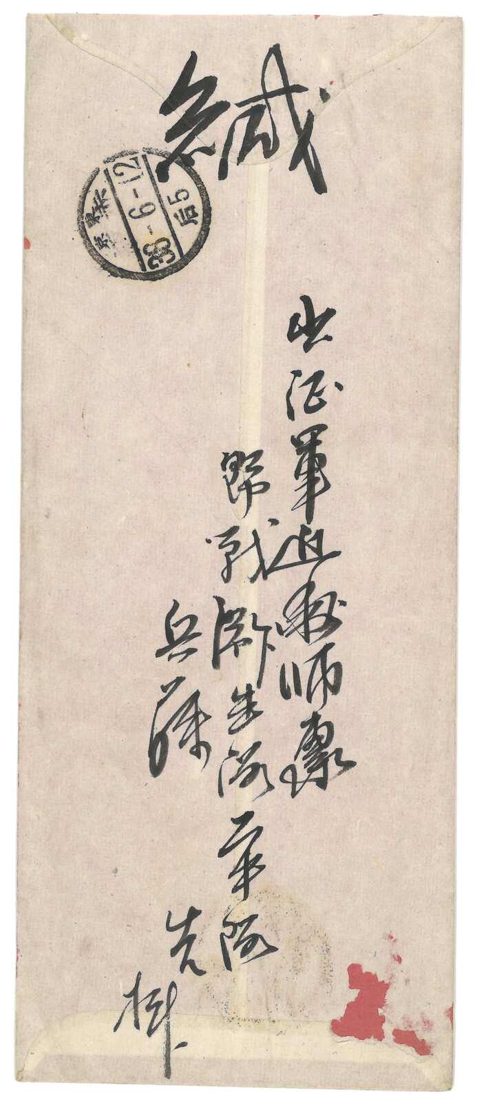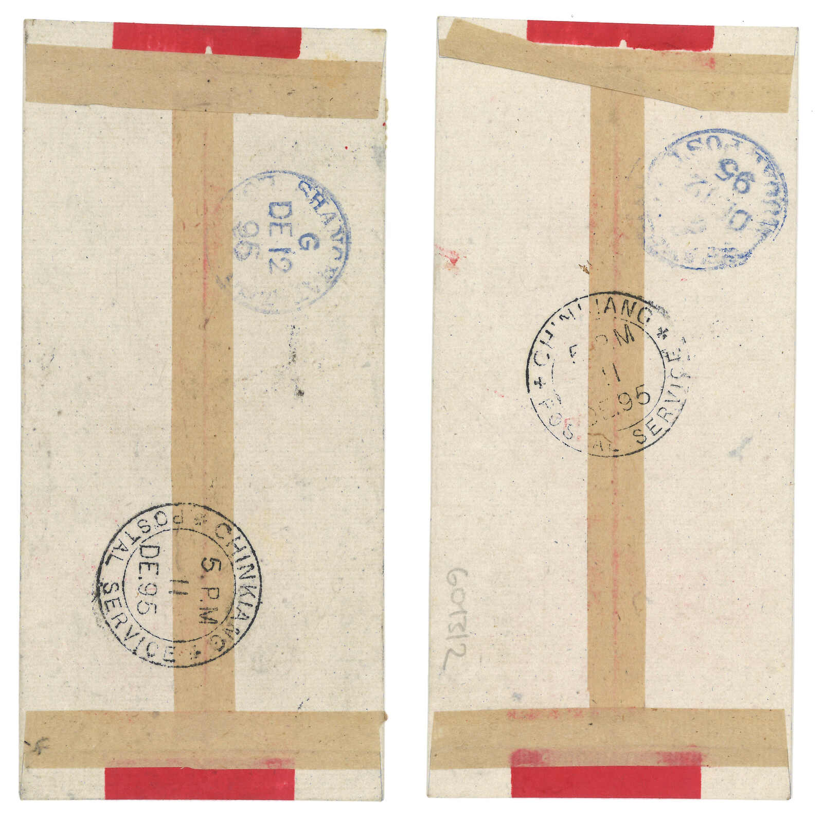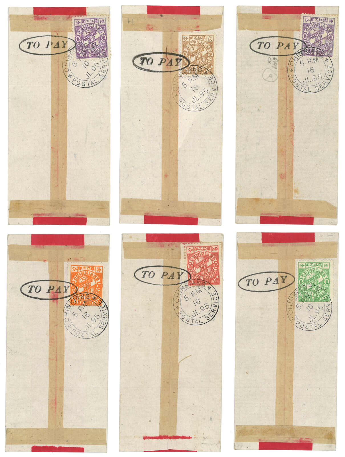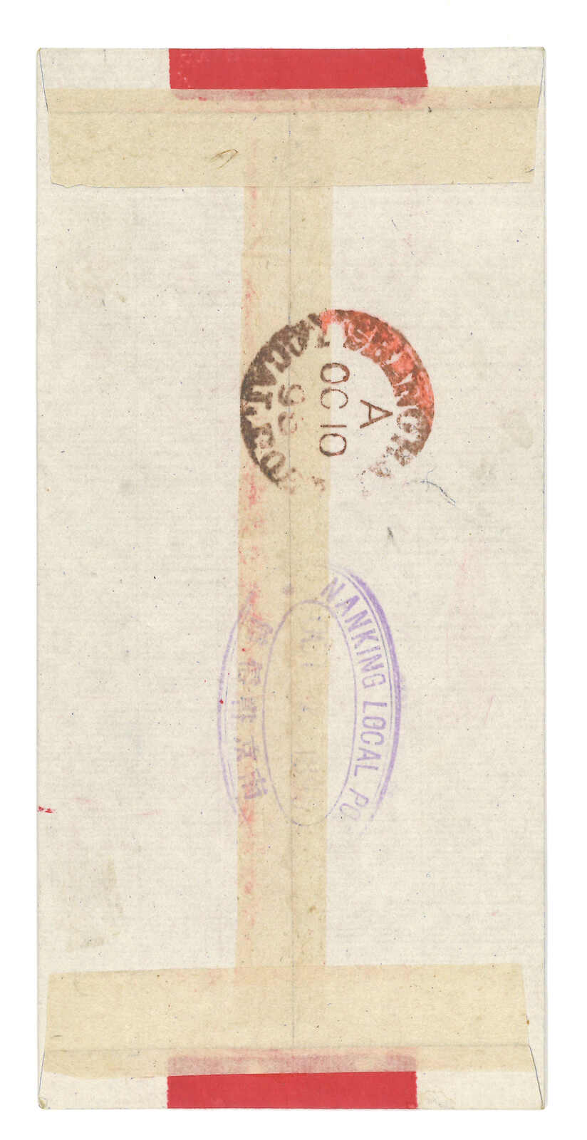 48 cover image1882 Tientsin (14 Jul) to the Peking Office of the Viceroy of Chihli. Red band cover, f.w. Large Dragon wide margin 3ca brown red (setting VI or VII) + 5ca pale yellow-ochre in horizontal strip of 4 (setting III, pos. 6-20-13-14) and 5 (full row of 7-5-4-12-8) on reverse, 16 times base rate, tied by multiple oval Tientsin type 1 seal, showing “Customs/Tientsin” double-ring d.s. and framed Chinese datestamp of the Tientsin Customs. Very fine and an exceptional internal franking, only one other cover has been recorded with as many examples of the wide margin 5candarins. A wonderful exhibition item of the highest calibre. Opened out for display. Note: There are approximately 8-10 covers recorded from the “Po Shu Ta Chu” (Post Office), which had taken over the functions of the defunct Hwa Yang Shu Hsin Kuan following its closure in 1882. The majority of covers known are either from the Starr collection or in the Chinese National Postage Stamp Museum. Since the “Po Shu Ta Chu” operated under the direct management of the Tientsin Customs, their mail had stamps affixed. All these covers were between July-December, 1882. Provenance: Starr (Sotheby’s, 12-13 September 1991, ot 303, realized GBP40,700). Siegel Auctions, 23 April 1996, lot 31. Illustrated as plate 147 on p. 253-254 in “A Comprehensive Illustration on Covers of Chinese Large Dragons” by James B. Whang. Cf. Lisa and Sven Beckeman, “Large Dragons on Red Band Covers, Journal of Chinese Philately, No. 280, Vol. 39, No.5, pp. 113-115 Holcombe believed it is genuine, with his 1996 certificate and two-page opinion. RPSL certificate of 2004 stated that “stamps show evidence of being attached to cover subsequent to posting and did not originate on cover”. Photocopies of the certificates are attached. As expert opinions are divided, buyers should exercise caution. We would not be in position to assist in obtaining further certificates nor accept return and refund for this lot.