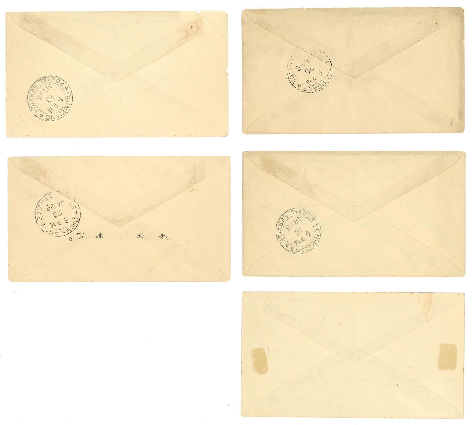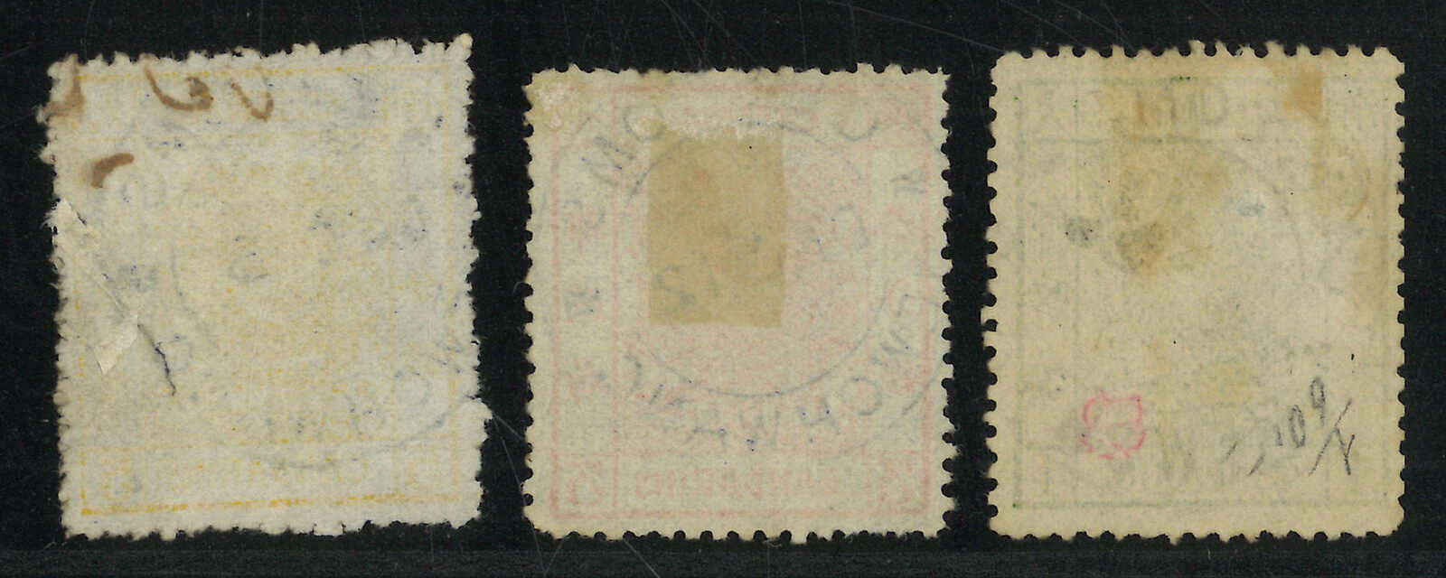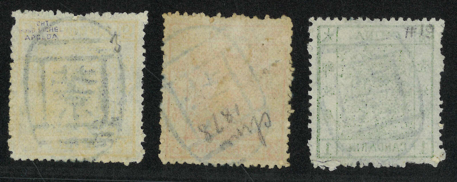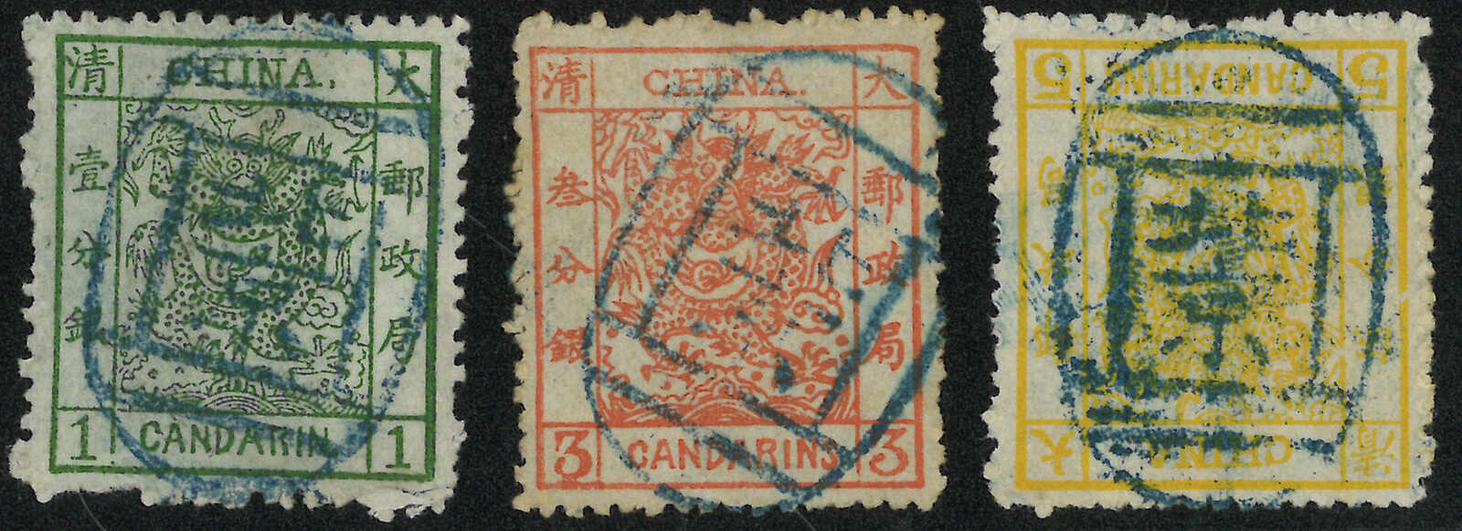 46 o image1883 thick paper, rough perfs., 1ca to 5ca, cancelled by seals in blue, very fine complete or large part of strikes. Chan 10-12.
