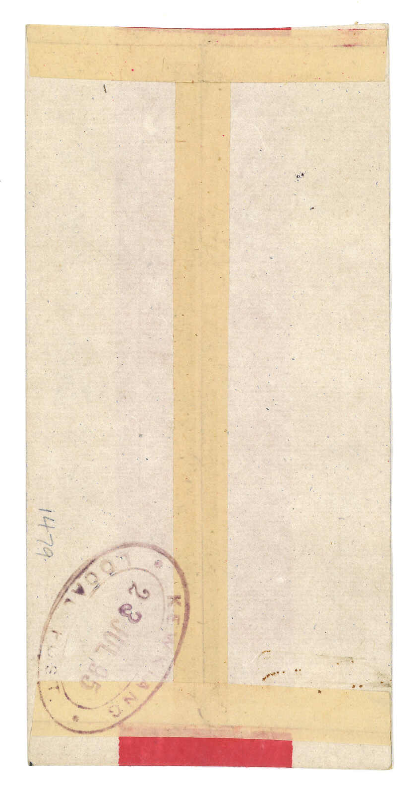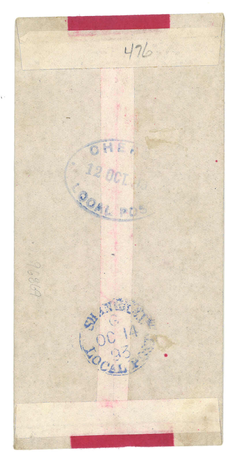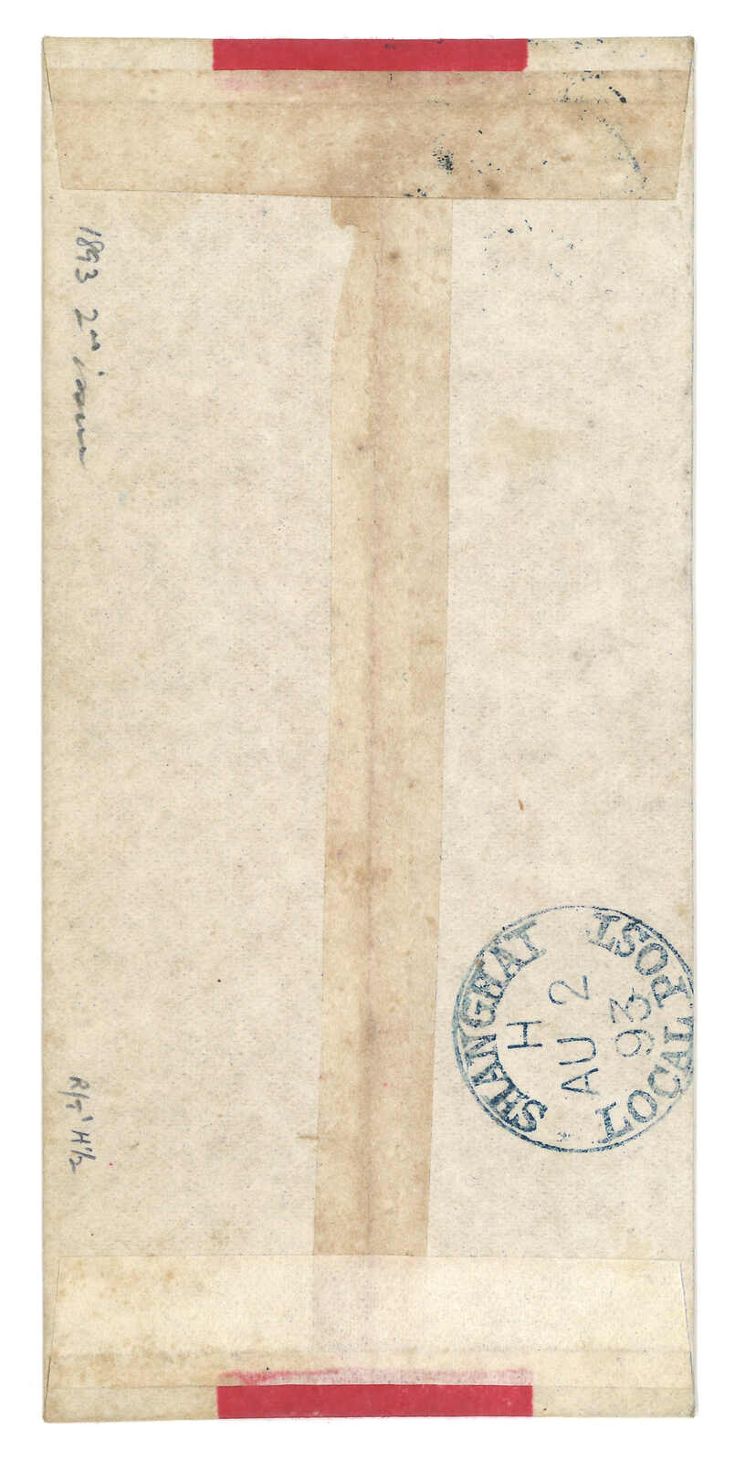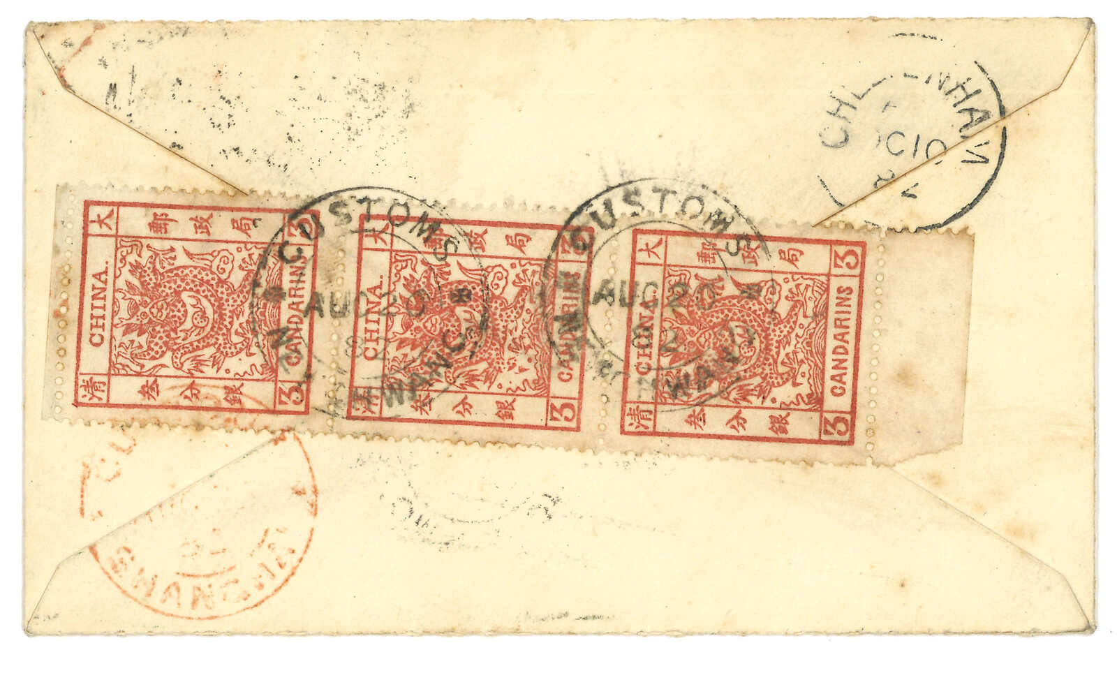 49 cover image1882. Newchwang (20 Aug) to England. F.w. marginal vertical strip of three 3-ca Large Dragons, cancelled by CUSTOMS NEWCHWANG cds.Transit CUSTOMS SHANGHAI (? Aug). Additionally affixed with French 25 ctm stamp cancelled by ‘SHANG-HAI CHINE’ French P.O. cds (25 Aug) with another alongside. French transit (8 Oct), Cheltenham arrival (10 Oct).