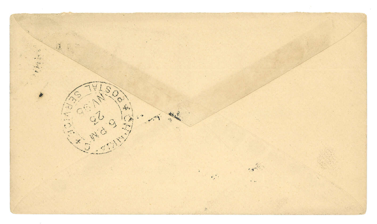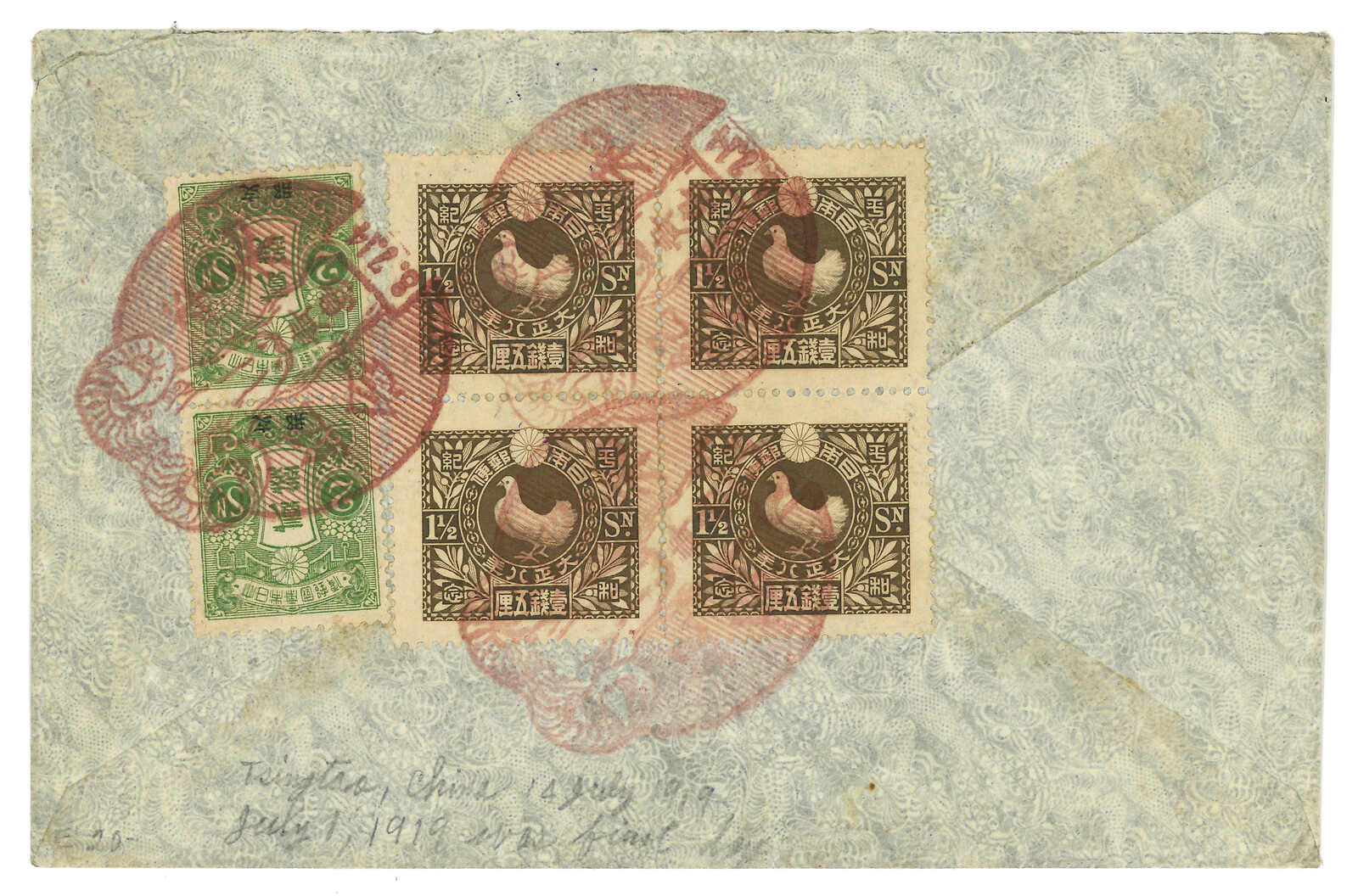 2385 cover image1919 Tsingtao (14 Jul) to USA, f.w. Taisho series ovpt. China 2s in pair + Restoration of Peace 1-1/2s in block of 4 on reverse, tied by Peace commemorative d.s. Transit Kobe (18 Jul). Arrived New York (5 Aug). Unusual franking on mails from Tsingtao.