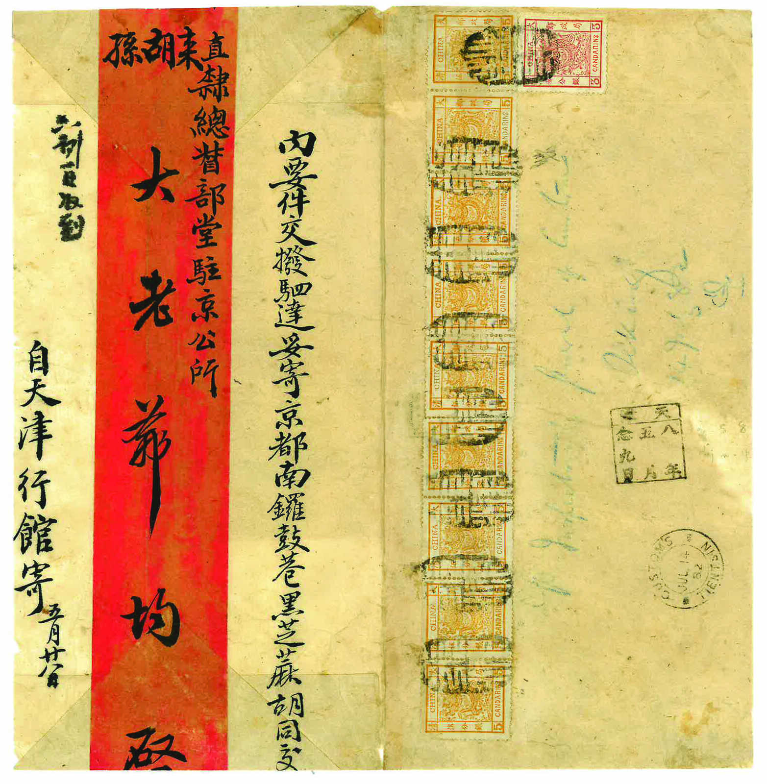 1882.7.14 天津寄北京直隸總督駐京公所,背貼寬邊大龍3分銀 + 5分銀橫四連 + 5分銀橫五 連, 銷橢圓形天津篆文戳,另鈐天津關日戳及撥駟達書信館碑形戳。十六倍郵資之例子,封已 剖開展 出,左側兩票有缺角,無損其撥駟達書信館與高面值封之雙重珍罕性。 出自斯塔遺集,1991.9.12-13蘇富比拍賣第303項。以40700英鎊成交。1996.4.23 Siegel lot 31。 黃建斌著《大龍信封存世考》第253-254頁第147號圖。 本件帶 (1) 1996年Holcombe證書和兩頁説明之副本,鑒定為真。(2) 2004年英國皇家郵學會證書副 本,意見為郵票是後加。鑒於鑒定意見大相徑庭,買方拍賣前務必審慎,本司將不能協助進一步鑒 定,也不接受退貨。(Image 1)