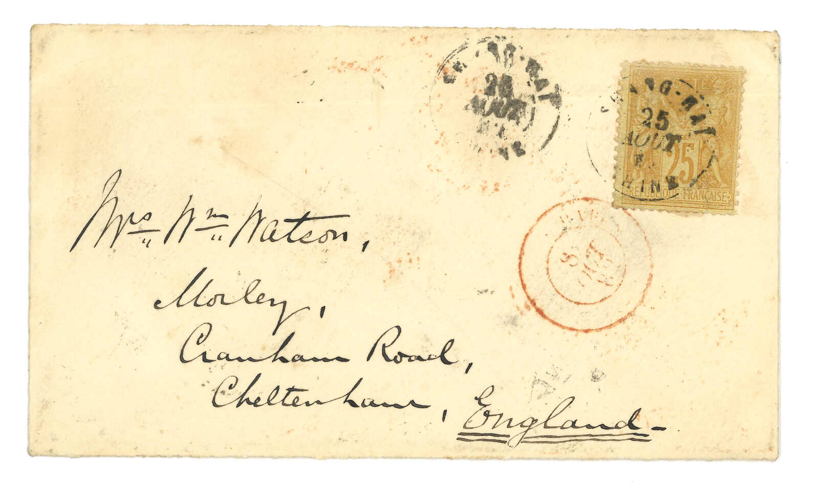 1882.8.20牛莊寄英國封,貼大龍叁分銀直三連帶邊紙,銷牛莊海關日戳,經上海關。加貼法郵25生丁票一枚, 銷上海法國客郵局8.25日戳,10.8經法國,10.10到達英國。(Image 1) (Image 2)