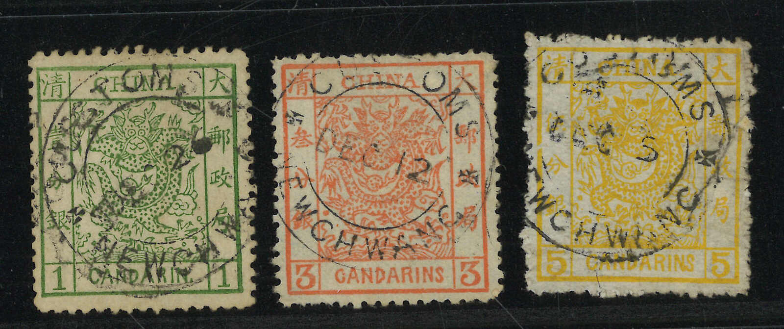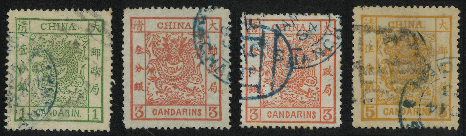 40 o image1882 wide margins 1ca to 5ca, and 1883 thick paper, clean-cut perfs., 3ca, cancelled by “Customs/Shanghai” daters of 1883-84 in blue, the 5ca has tear and other faults, the rest are fine. Chan 4-6, 8