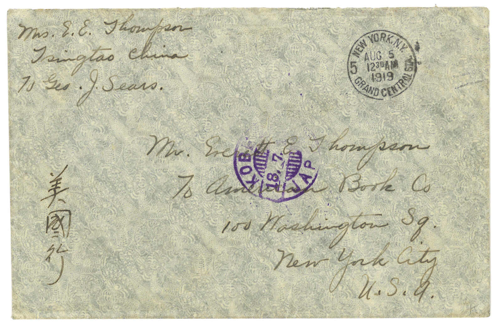 1919.7.14 青島寄美國,背貼田澤型切手加蓋支那2錢雙連 + 和平紀念1錢5厘四方連,銷和平紀念日戳。7.18經神戶。8.5抵紐約。五四運動因青島問題而起,此件為事件兩個月后日郵一戰紀念票用於青島,歷史張力十足。(Image 1) (Image 2)