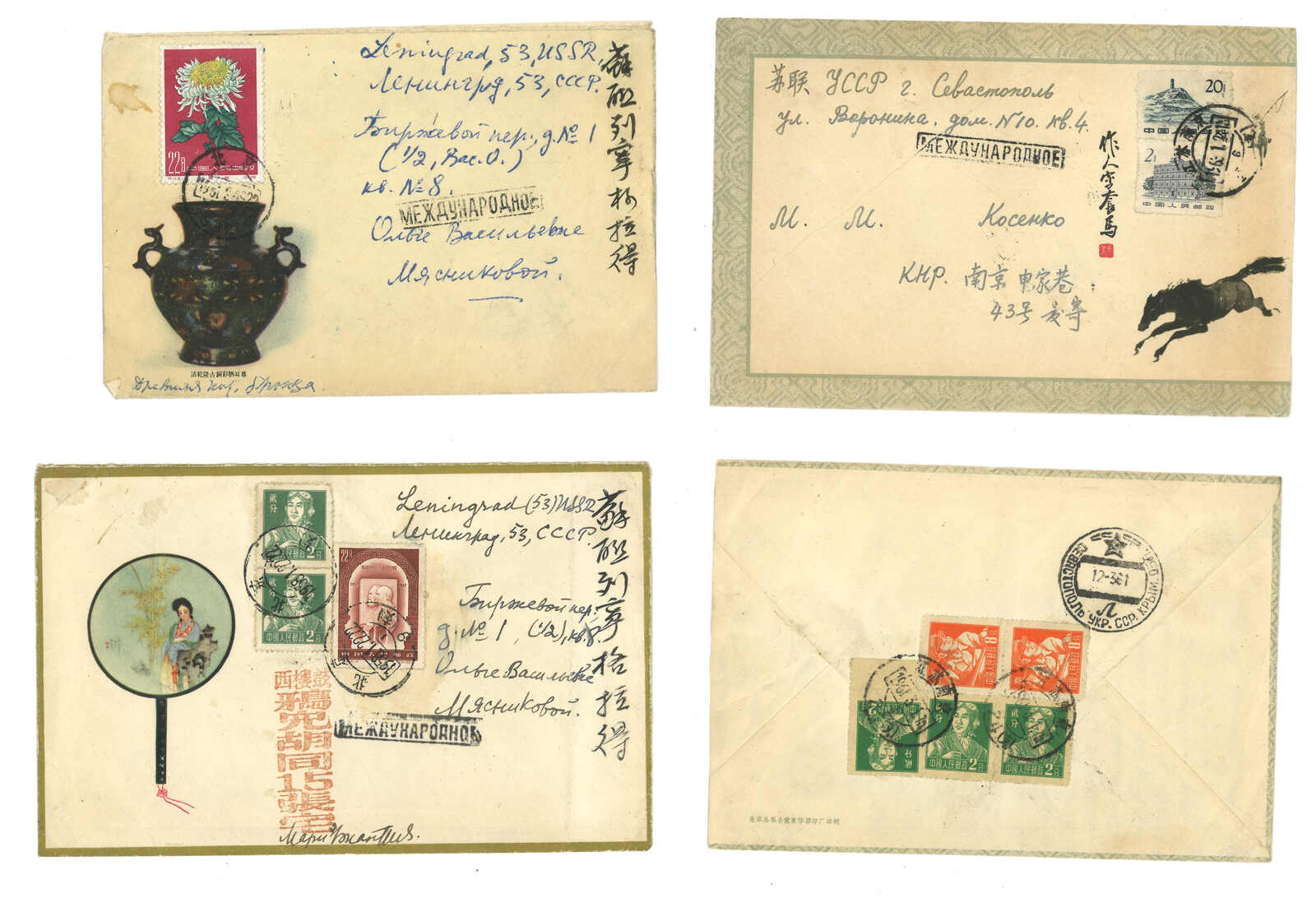 1960s a group of 6 covers from China to USSR, f.w. C44 October Revolution, C77 Lenin, S44 Chysanthemums and various R series singles, tied by Peking, Nanking and other cds.
