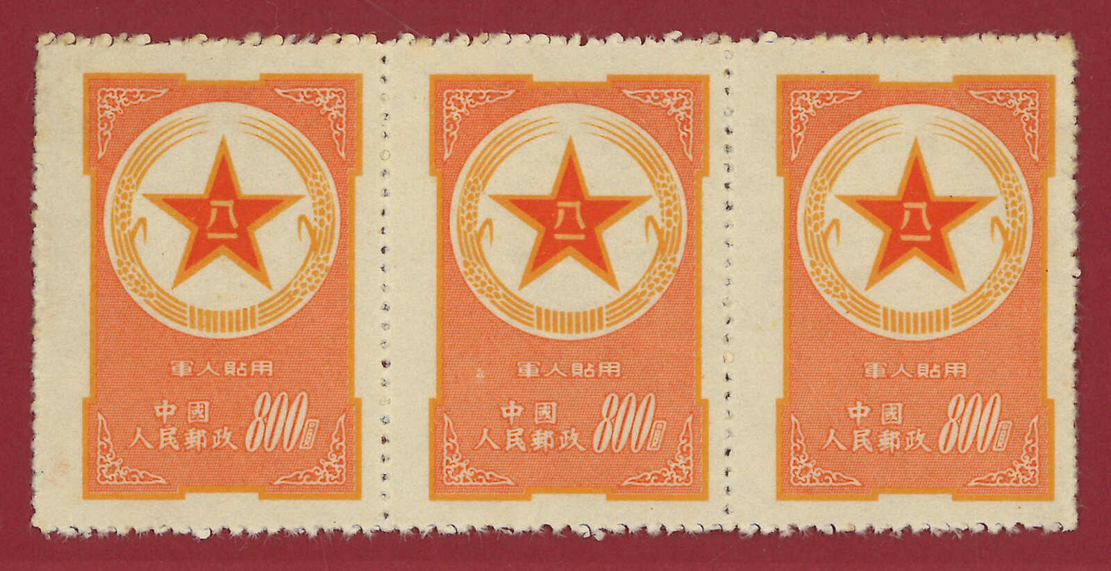 1953年M1黃軍郵橫三連新,中央一枚有折。無貼。(Image 1)