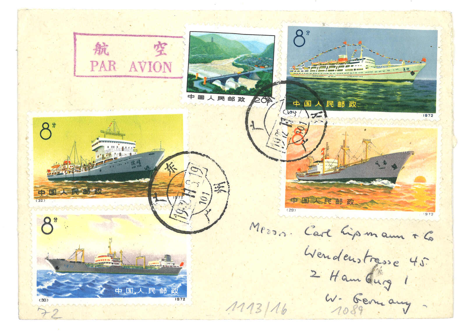 1972 Canton (8 Nov) to Germany. Airmail cover, f.w N29-32 Ships complete set + R14 20f, tied by Kwangtung Canton cds.