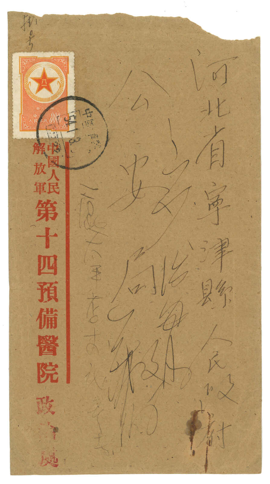 1954.3.1 解放軍第十四預備醫院掛號封寄寧津,貼黃軍郵,銷“中國 軍郵”日戳。(Image 1)